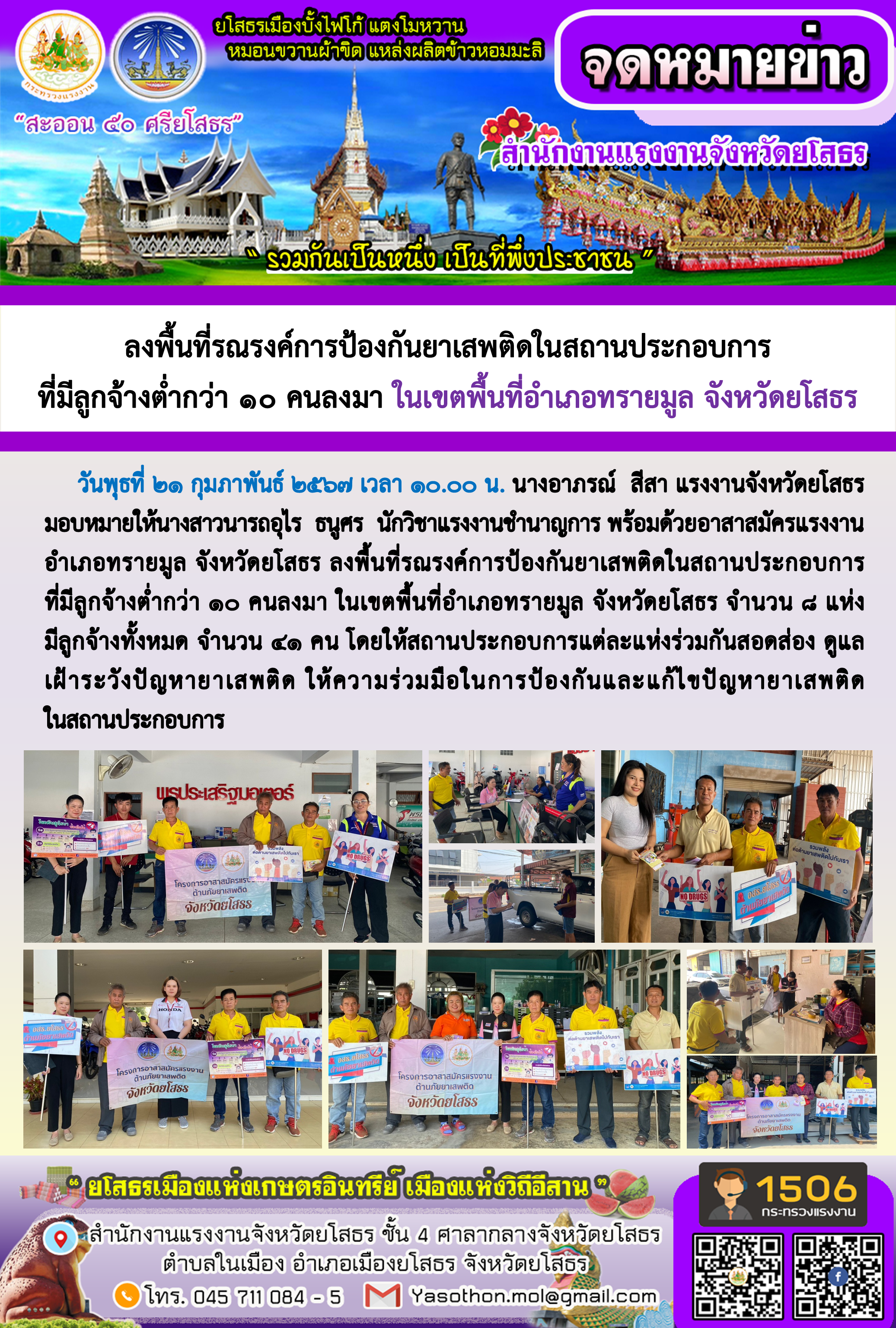 สรจ.ยโสธร ลงพื้นที่รณรงค์การป้องกันยาเสพติดในสถานประกอบการ ที่มีลูกจ้างต่ำกว่า 10 คนลงมา ในเขตพื้นที่อำเภอทรายมูล จังหวัดยโสธร