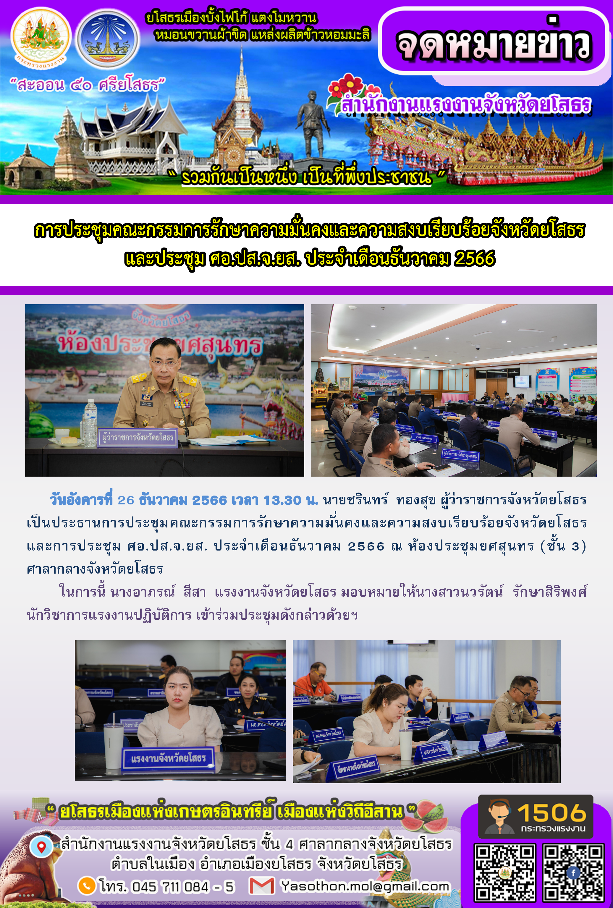 สรจ.ยโสธร เข้าร่วมการประชุมคณะกรรมการรักษาความมั่นคงและความสงบเรียบร้อยจังหวัดยโสธร และการประชุม ศอ.ปส.จ.ยส. ประจำเดือนธันวาคม 2566