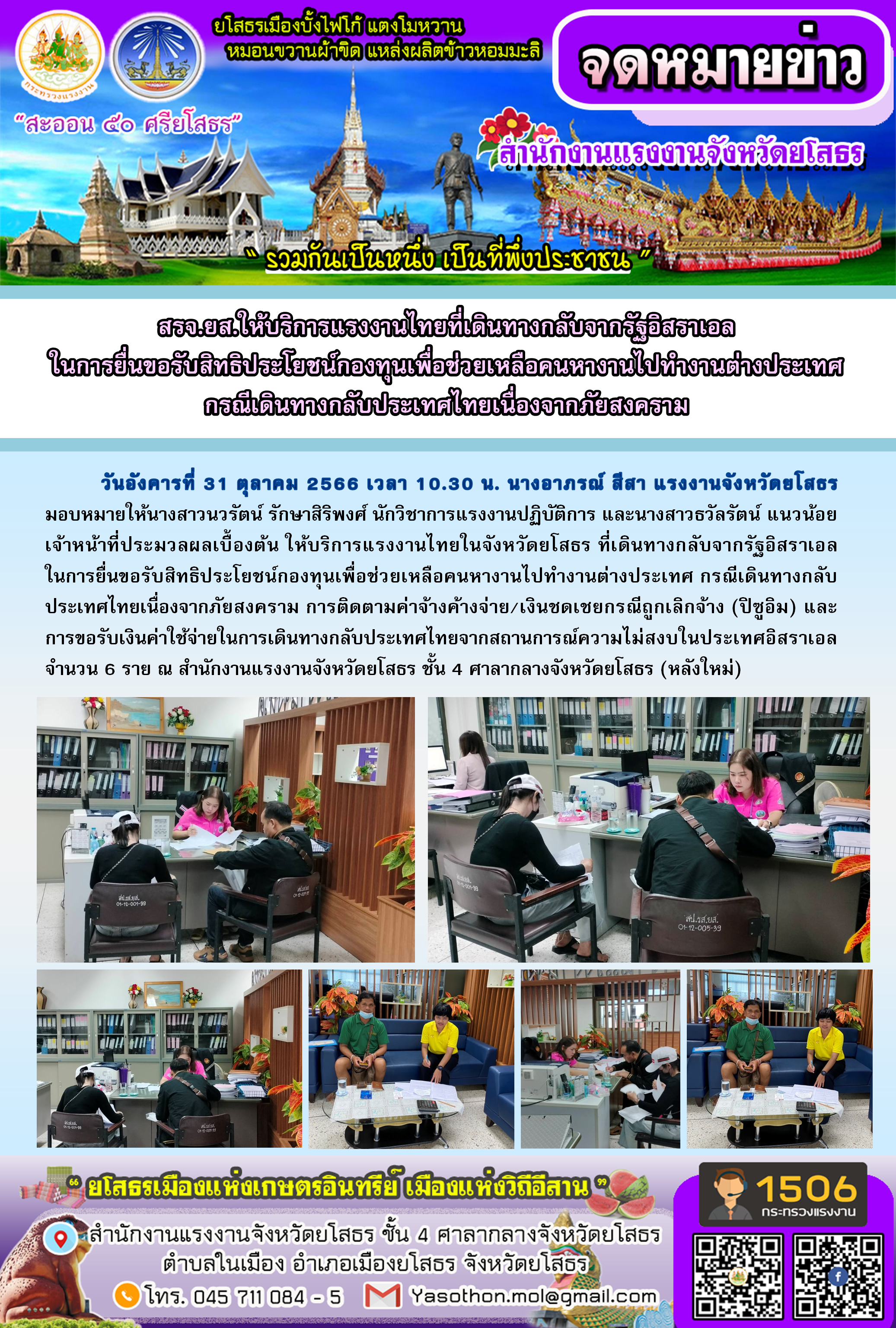 สรจ.ยโสธร ให้บริการแรงงานไทยที่เดินทางกลับจากรัฐอิสราเอล ในการยื่นขอรับสิทธิประโยชน์กองทุนเพื่อช่วยเหลือคนหางานไปทำงานต่างประเทศ กรณีเดินทางกลับประเทศไทยเนื่องจากภัยสงคราม