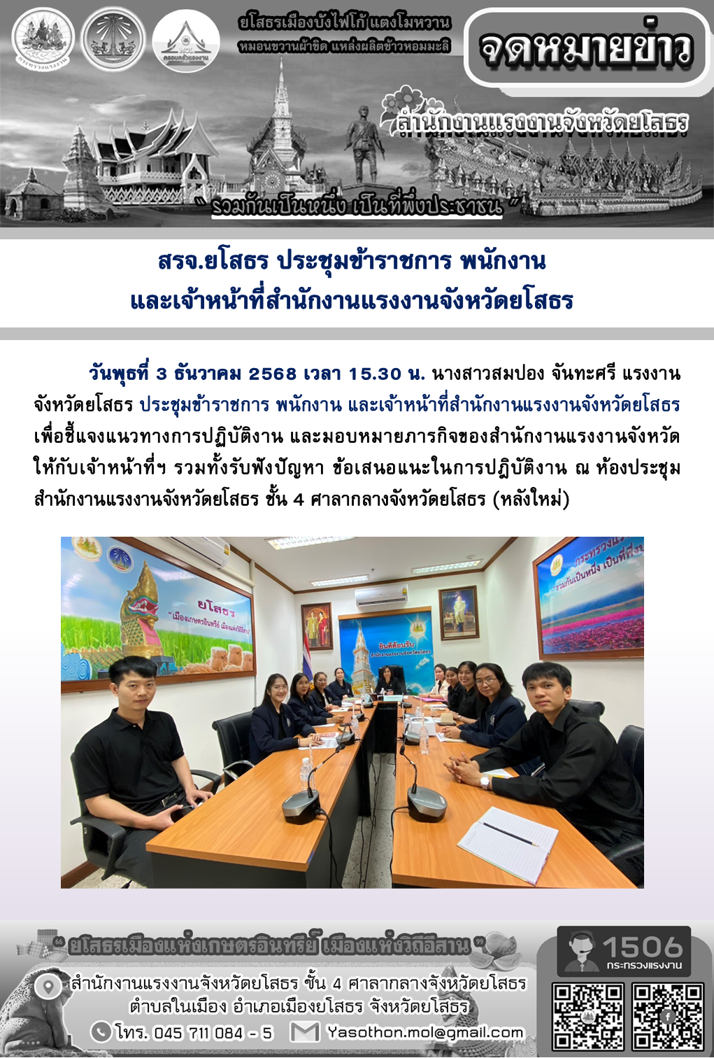 สรจ.ยโสธร ประชุมข้าราชการ พนักงาน และเจ้าหน้าที่สำนักงานแรงงานจังหวัดยโสธร