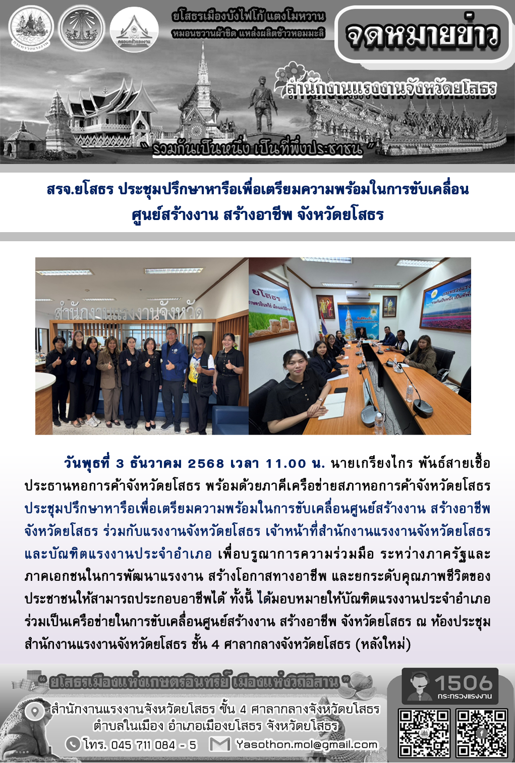 สรจ.ยโสธร ประชุมปรึกษาหารือเพื่อเตรียมความพร้อมในการขับเคลื่อน ศูนย์สร้างงาน สร้างอาชีพ จังหวัดยโสธร