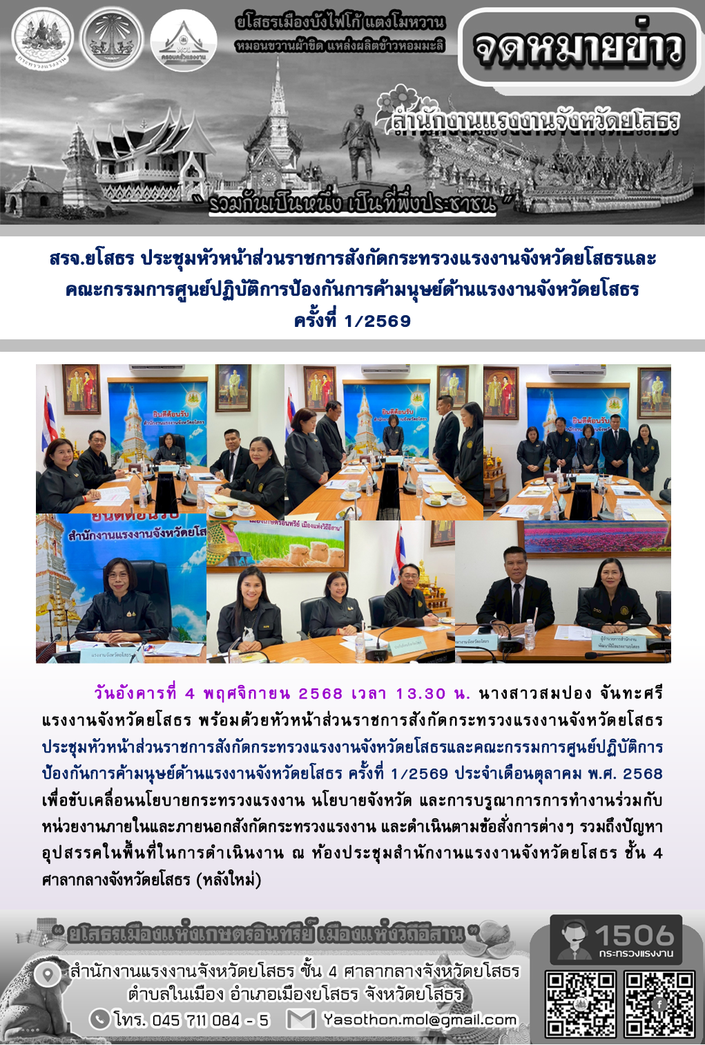 สรจ.ยโสธร ประชุมหัวหน้าส่วนราชการสังกัดกระทรวงแรงงานจังหวัดยโสธรและคณะกรรมการศูนย์ปฏิบัติการป้องกันการค้ามนุษย์ด้านแรงงานจังหวัดยโสธร ครั้งที่ 1/2569