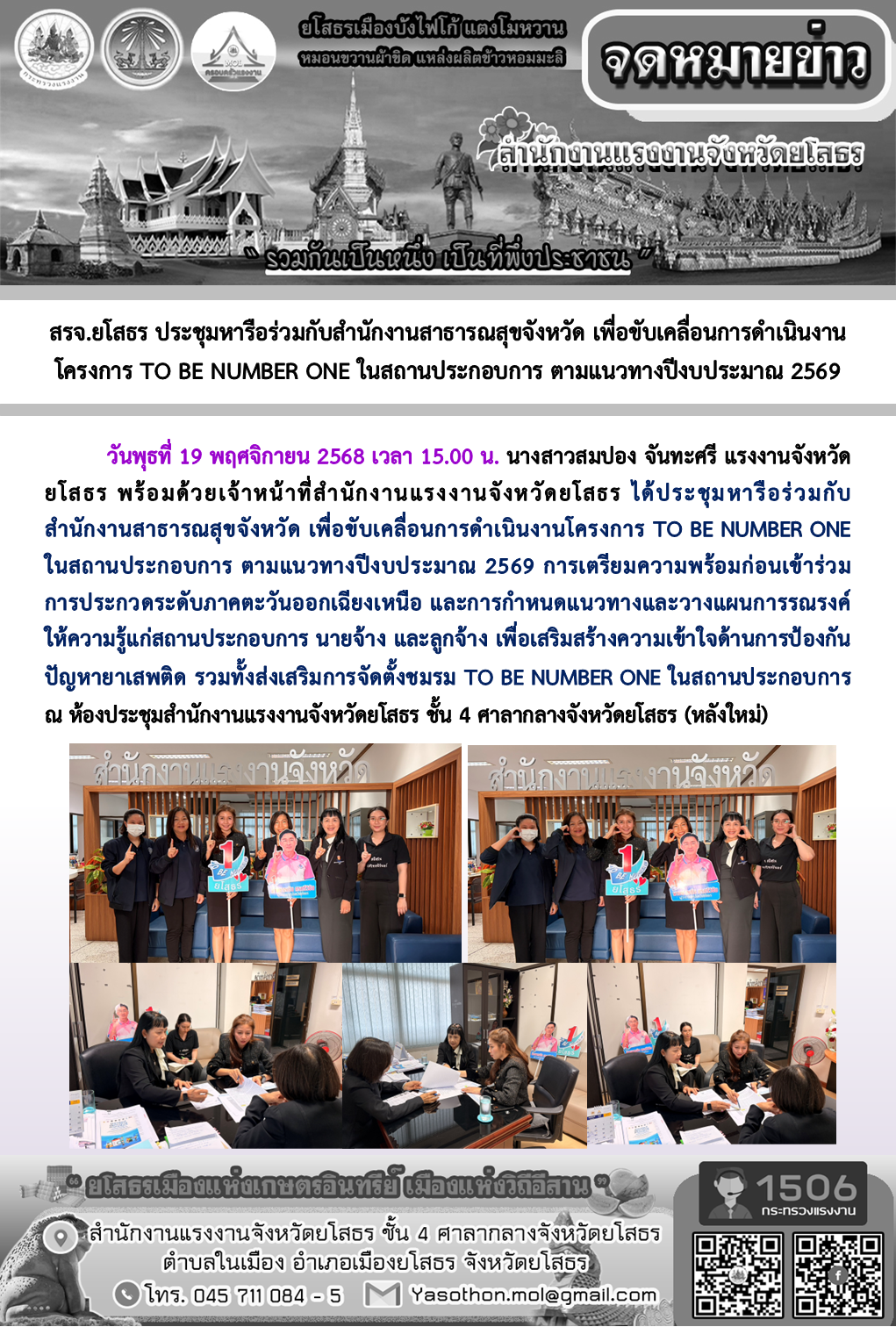 สรจ.ยโสธร ประชุมหารือร่วมกับสำนักงานสาธารณสุขจังหวัด เพื่อขับเคลื่อนการดำเนินงานโครงการ TO BE NUMBER ONE ในสถานประกอบการ ตามแนวทางปีงบประมาณ 2569