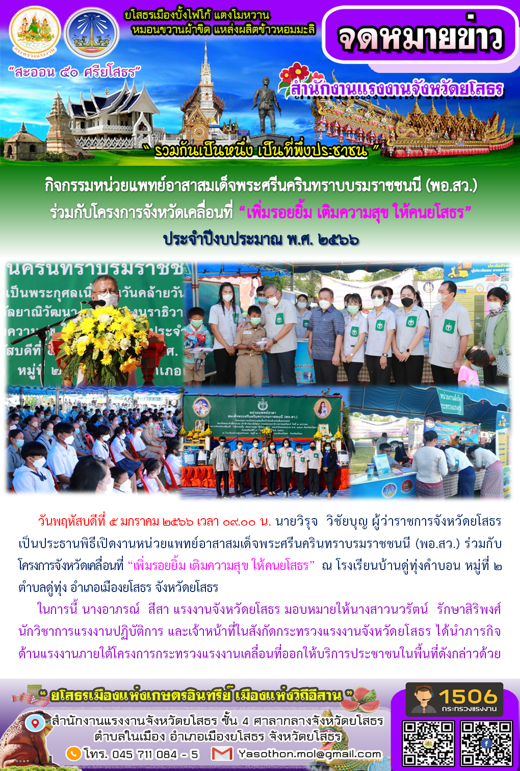 สรจ.ยโสธร ร่วมกิจกรรมหน่วยแพทย์อาสาสมเด็จพระศรีนครินทราบบรมราชชนนี (พอ.สว.) ร่วมกับโครงการจังหวัดเคลื่อนที่ “เพิ่มรอยยิ้ม เติมความสุข ให้คนยโสธร” ประจำปีงบประมาณ พ.ศ. 2566