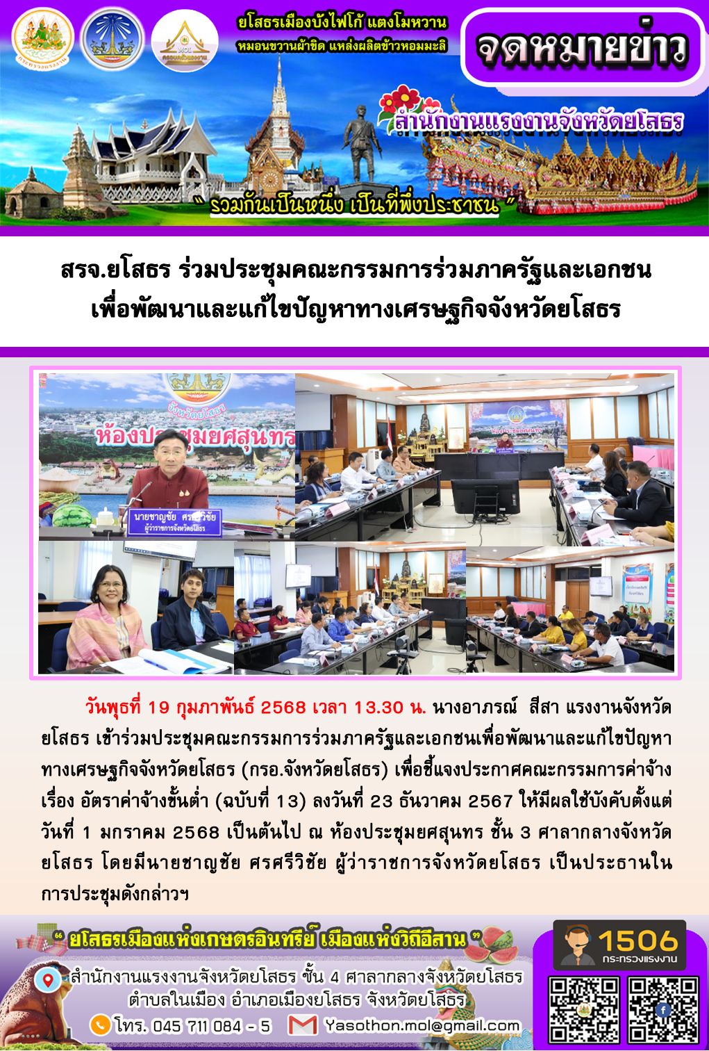 สรจ.ยโสธร ร่วมประชุมคณะกรรมการร่วมภาครัฐและเอกชน เพื่อพัฒนาและแก้ไขปัญหาทางเศรษฐกิจจังหวัดยโสธร