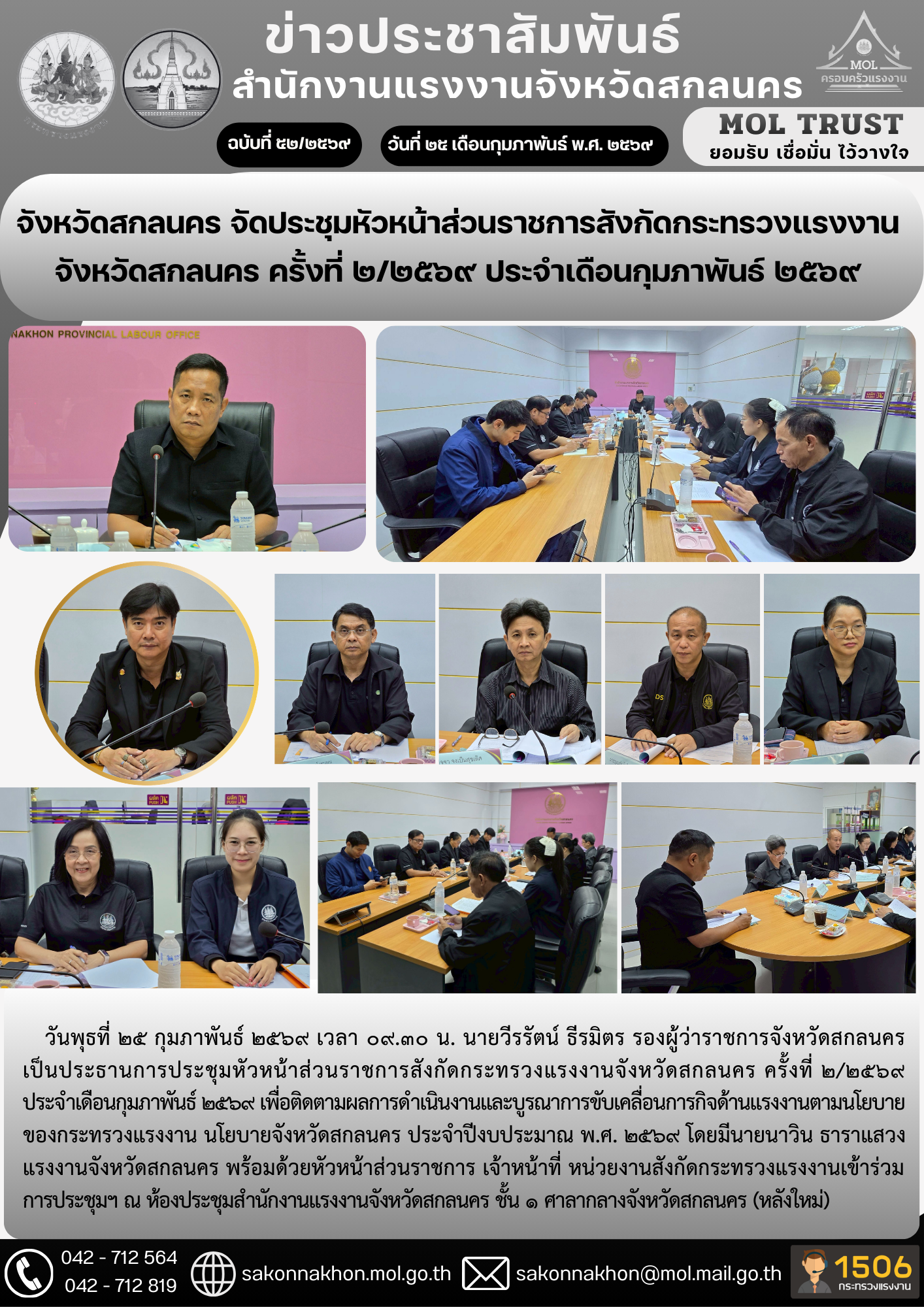 จังหวัดสกลนคร จัดประชุมหัวหน้าส่วนราชการสังกัดกระทรวงแรงงาน จังหวัดสกลนคร ครั้งที่ 2/2569 ประจำเดือนกุมภาพันธ์ 2569