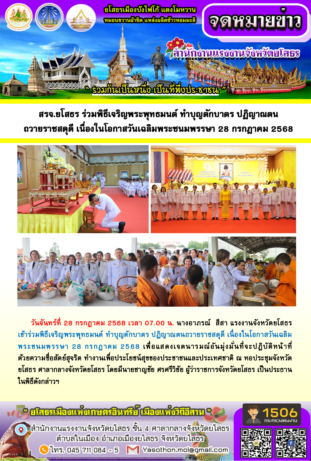 สรจ.ยโสธร ร่วมพิธีเจริญพระพุทธมนต์ ทำบุญตักบาตร ปฏิญาณตน ถวายราชสดุดี เนื่องในโอกาสวันเฉลิมพระชนมพรรษา 28 กรกฎาคม 2568