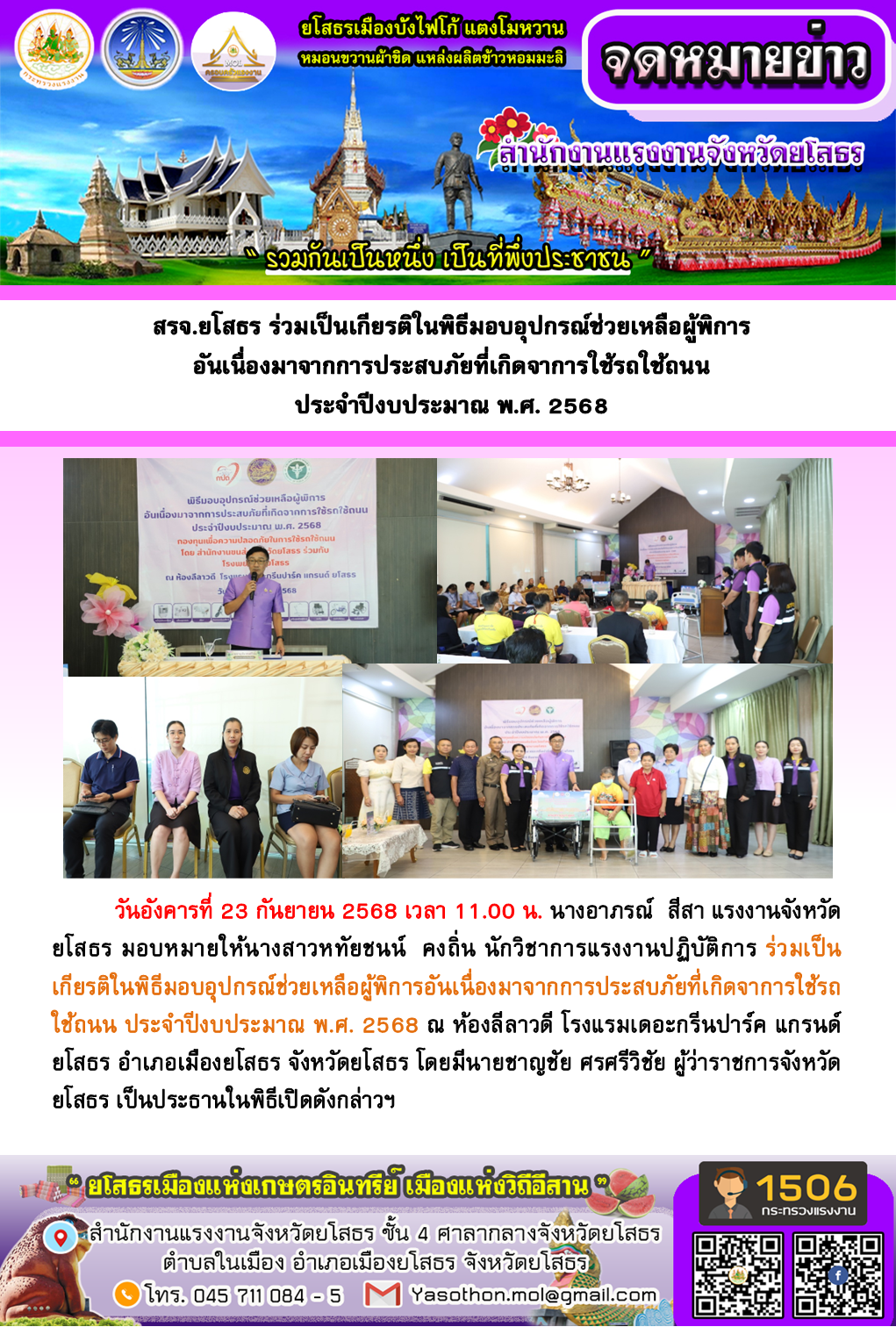 สรจ.ยโสธร ร่วมเป็นเกียรติในพิธีมอบอุปกรณ์ช่วยเหลือผู้พิการ อันเนื่องมาจากการประสบภัยที่เกิดจาการใช้รถใช้ถนน ประจำปีงบประมาณ พ.ศ. 2568