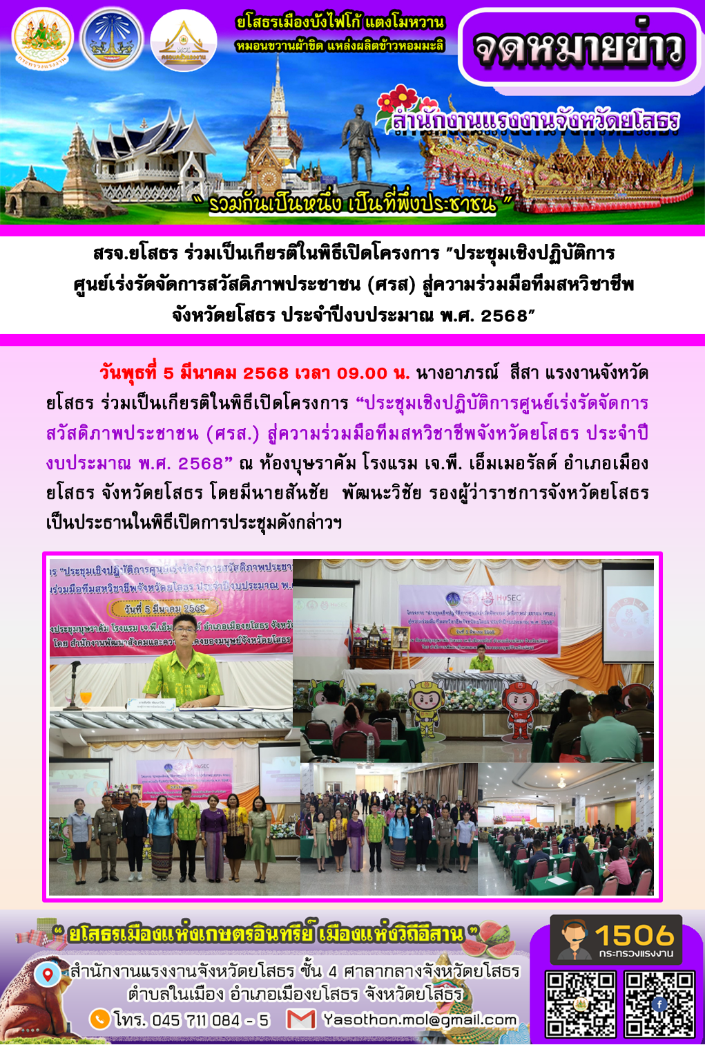 สรจ.ยโสธร ร่วมเป็นเกียรติในพิธีเปิดโครงการ “ประชุมเชิงปฏิบัติการ ศูนย์เร่งรัดจัดการสวัสดิภาพประชาชน (ศรส) สู่ความร่วมมือทีมสหวิชาชีพ จังหวัดยโสธร ประจำปีงบประมาณ พ.ศ. 2568”