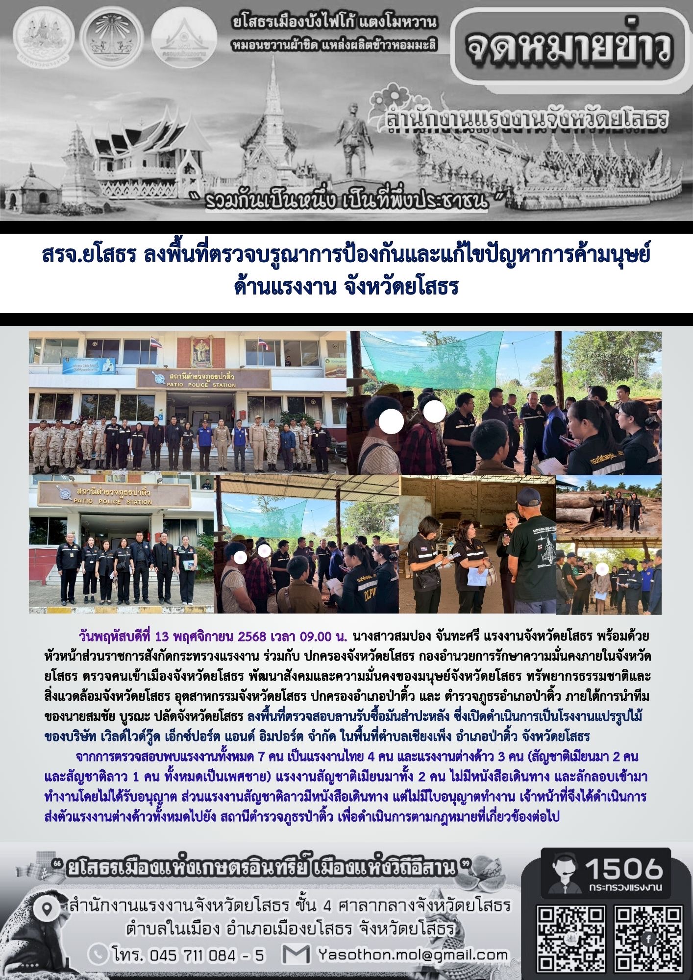 สรจ.ยโสธร ลงพื้นที่ตรวจบรูณาการป้องกันและแก้ไขปัญหาการค้ามนุษย์ ด้านแรงงาน จังหวัดยโสธร
