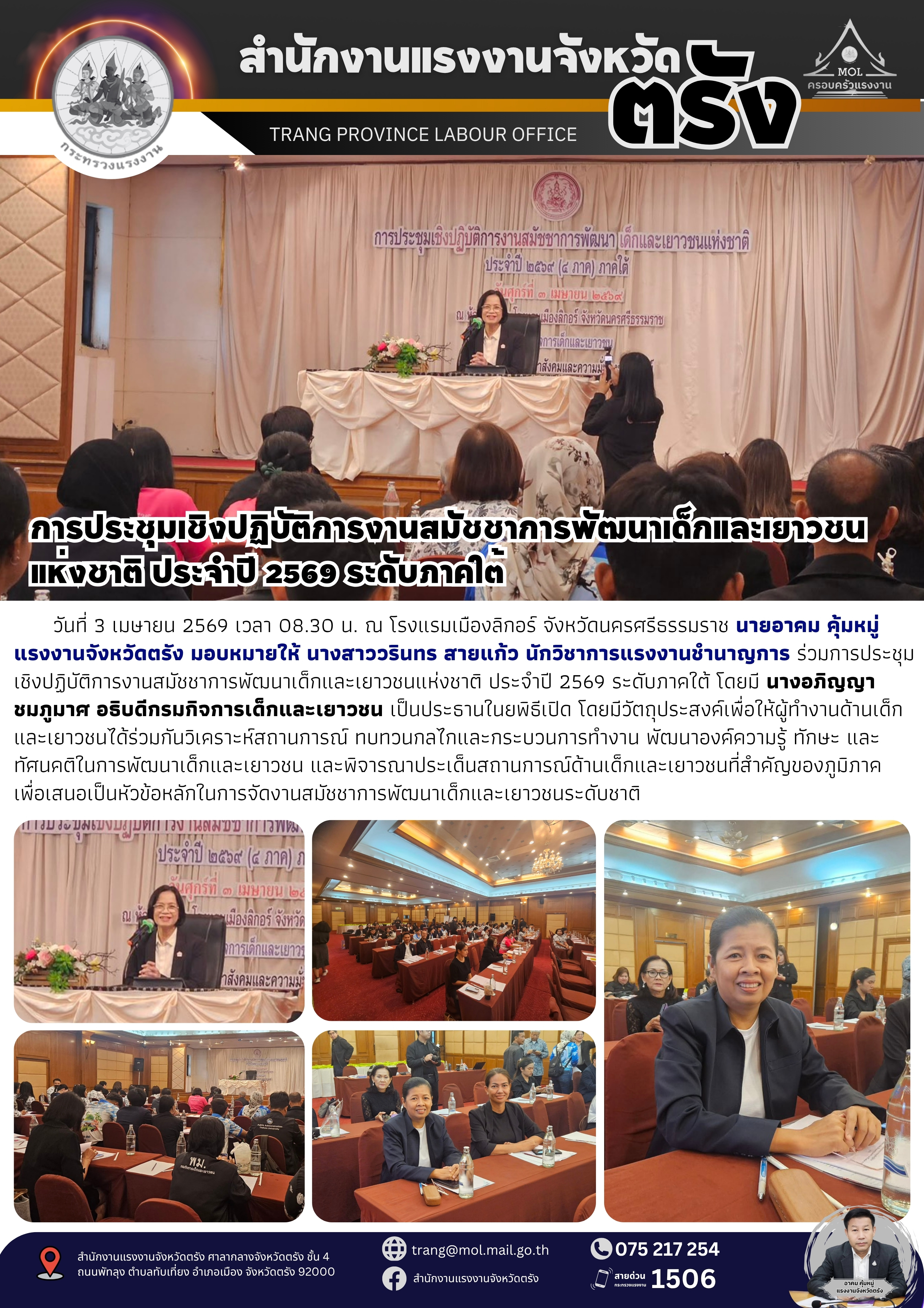 สรจ.ตรัง ร่วมการประชุมเชิงปฏิบัติการงานสมัชชาการพัฒนาเด็กและเยาวชนแห่งชาติ ประจำปี 2569 ระดับภาคใต้