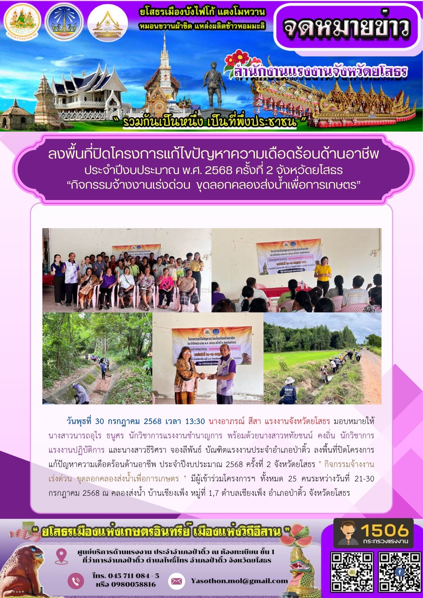 สรจ.ยโสธร ลงพื้นที่ปิดโครงการแก้ไขปัญหาความเดือนร้อนด้านอาชีพ ประจำปีงบประมาณ พ.ศ.2568 ครั้งที่ 2 จังหวัดยโสธร “กิจกรรมจ้างงานเร่งด่วน ขุดลอกคลองส่งน้ำเพื่อการเกษตร”