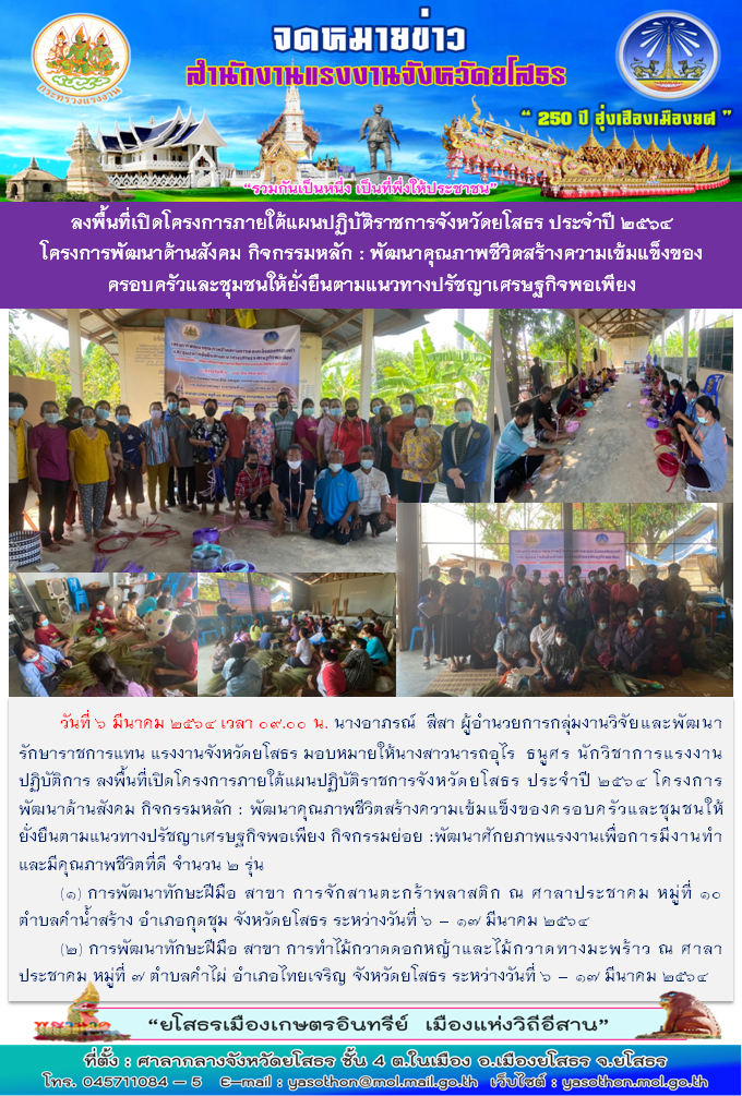 สรจ.ยโสธร ลงพื้นที่เปิดโครงการภายใต้แผนปฏิบัติราชการจังหวัดยโสธร ประจำปี 2564 โครงการพัฒนาด้านสังคม กิจกรรมหลัก : พัฒนาคุณภาพชีวิตสร้างความเข้มแข็งของครอบครัวและชุมชนให้ยั่งยืนตามแนวทางปรัชญาเศรษฐกิจพอเพียง