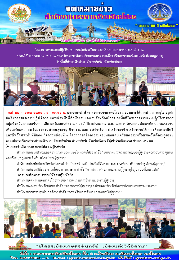 สรจ.ยโสธร ลงพื้นที่โครงการตามแผนปฏิบัติราชการกลุ่มจังหวัดภาคตะวันออกเฉียงเหนือตอนล่าง 2 ประจำปีงบประมาณ พ.ศ. 2565 โครงการพัฒนาศักยภาพแรงงานเพื่อเตรียมความพร้อมรองรับสังคมสูงอายุ ในพื้นที่ตำบลฟ้าห่วน อำเภอค้อวัง จังหวัดยโสธร