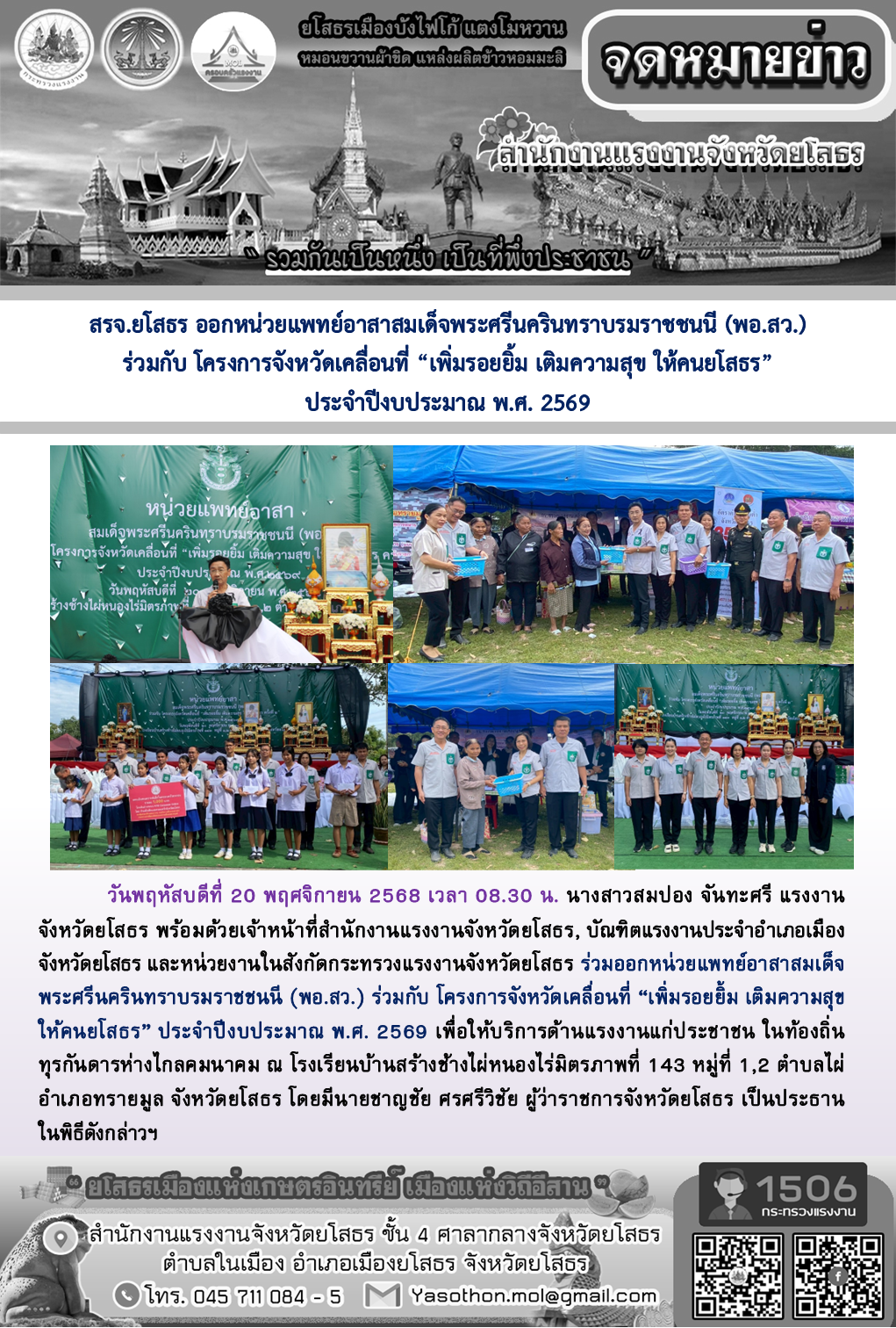 สรจ.ยโสธร ออกหน่วยแพทย์อาสาสมเด็จพระศรีนครินทราบรมราชชนนี (พอ.สว.) ร่วมกับ โครงการจังหวัดเคลื่อนที่ “เพิ่มรอยยิ้ม เติมความสุข ให้คนยโสธร” ประจำปีงบประมาณ พ.ศ. 2569