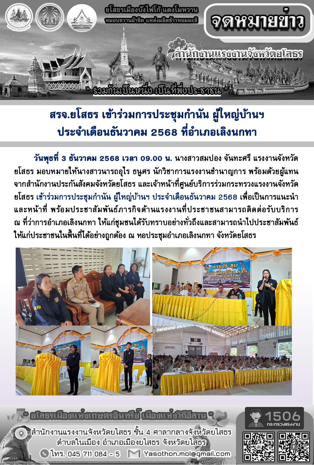 สรจ.ยโสธร เข้าร่วมการประชุมกำนัน ผู้ใหญ่บ้านฯ ประจำเดือนธันวาคม 2568 ที่อำเภอเลิงนกทา