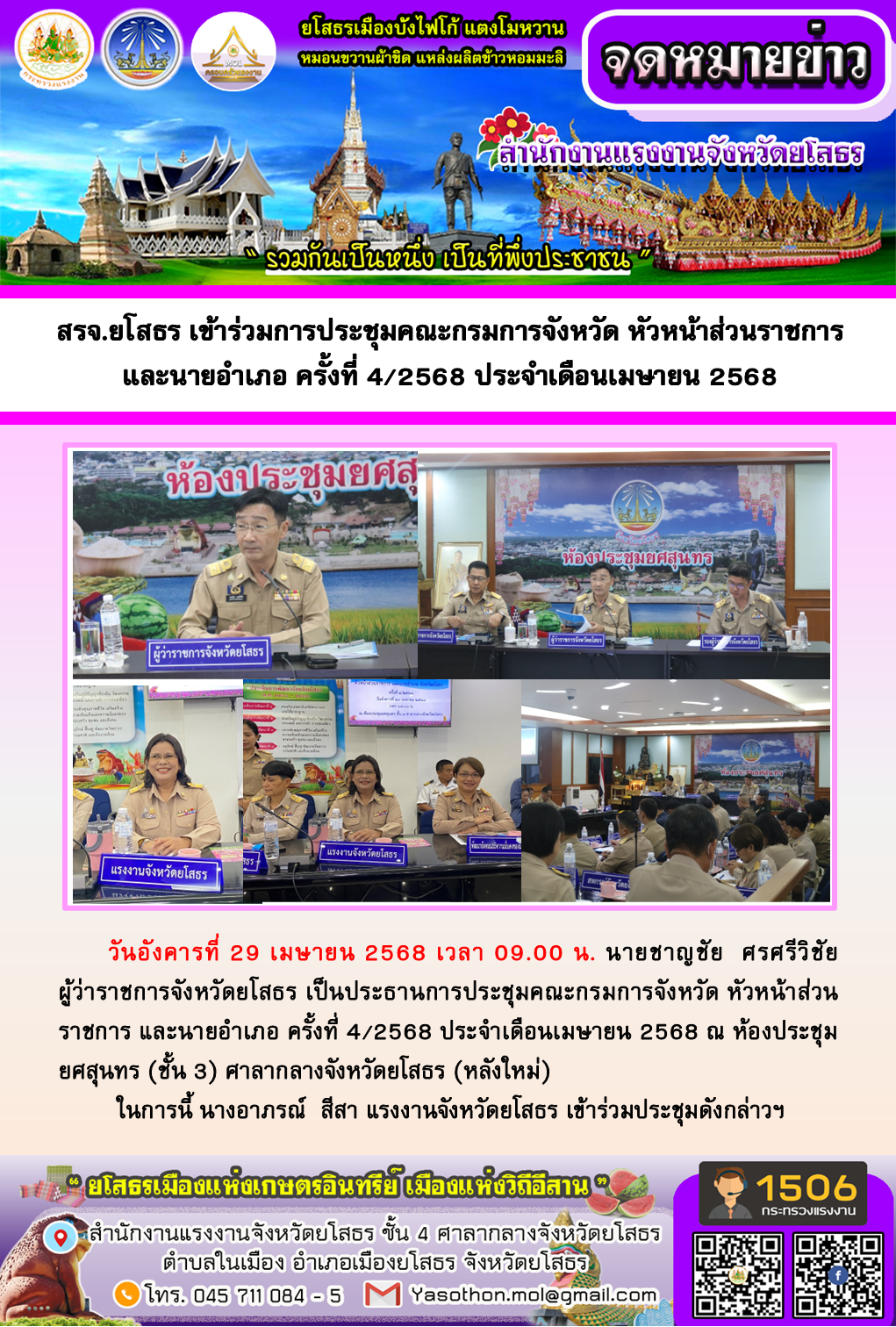 สรจ.ยโสธร เข้าร่วมการประชุมคณะกรมการจังหวัด หัวหน้าส่วนราชการ และนายอำเภอ ครั้งที่ 4/2568 ประจำเดือนเมษายน 2568
