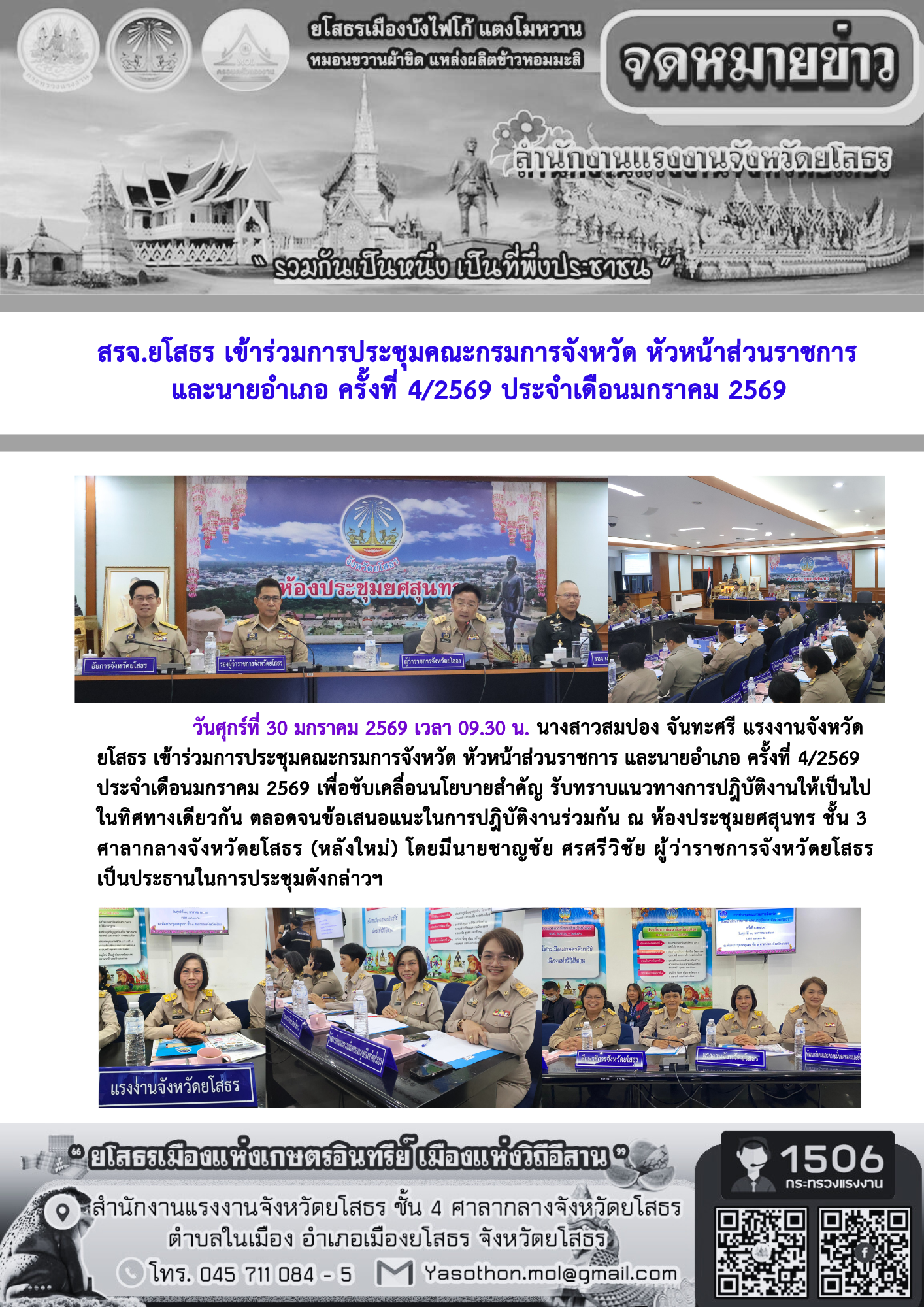 สรจ.ยโสธร เข้าร่วมการประชุมคณะกรมการจังหวัด หัวหน้าส่วนราชการ และนายอำเภอ ครั้งที่ 4/2569 ประจำเดือนมกราคม 2569