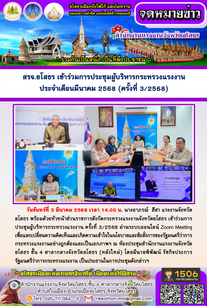 สรจ.ยโสธร เข้าร่วมการประชุมผู้บริหารกระทรวงแรงงาน ประจำเดือนมีนาคม 2568 (ครั้งที่ 3/2568)