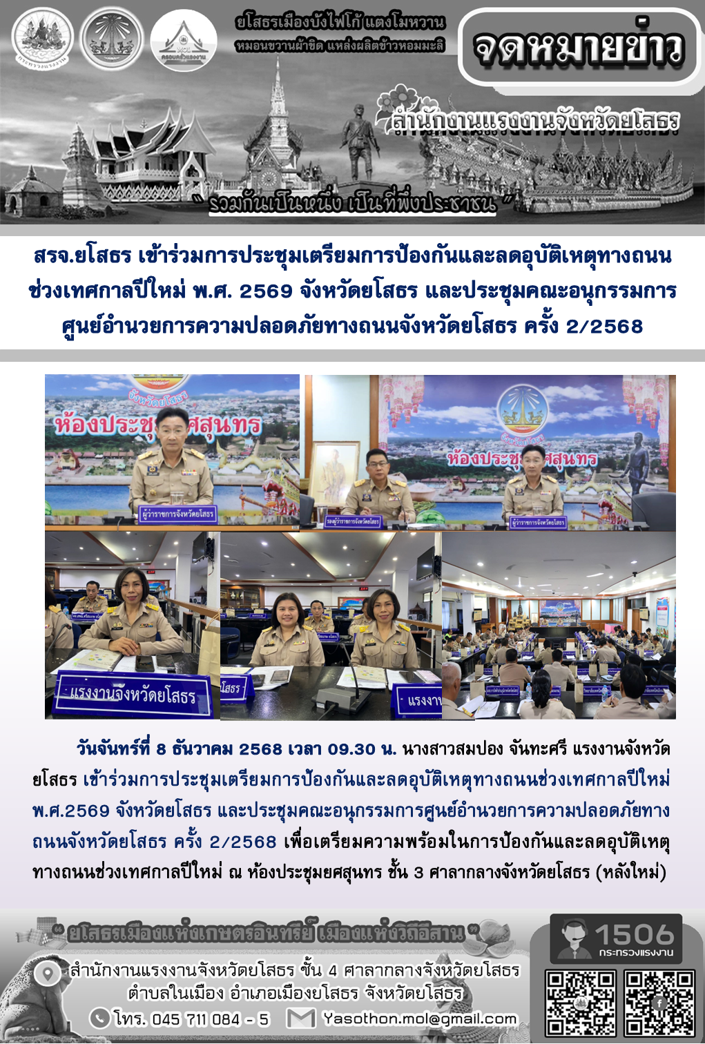 สรจ.ยโสธร เข้าร่วมการประชุมเตรียมการป้องกันและลดอุบัติเหตุทางถนน ช่วงเทศกาลปีใหม่ พ.ศ. 2569 จังหวัดยโสธร และประชุมคณะอนุกรรมการศูนย์อำนวยการความปลอดภัยทางถนนจังหวัดยโสธร ครั้ง 2/2568