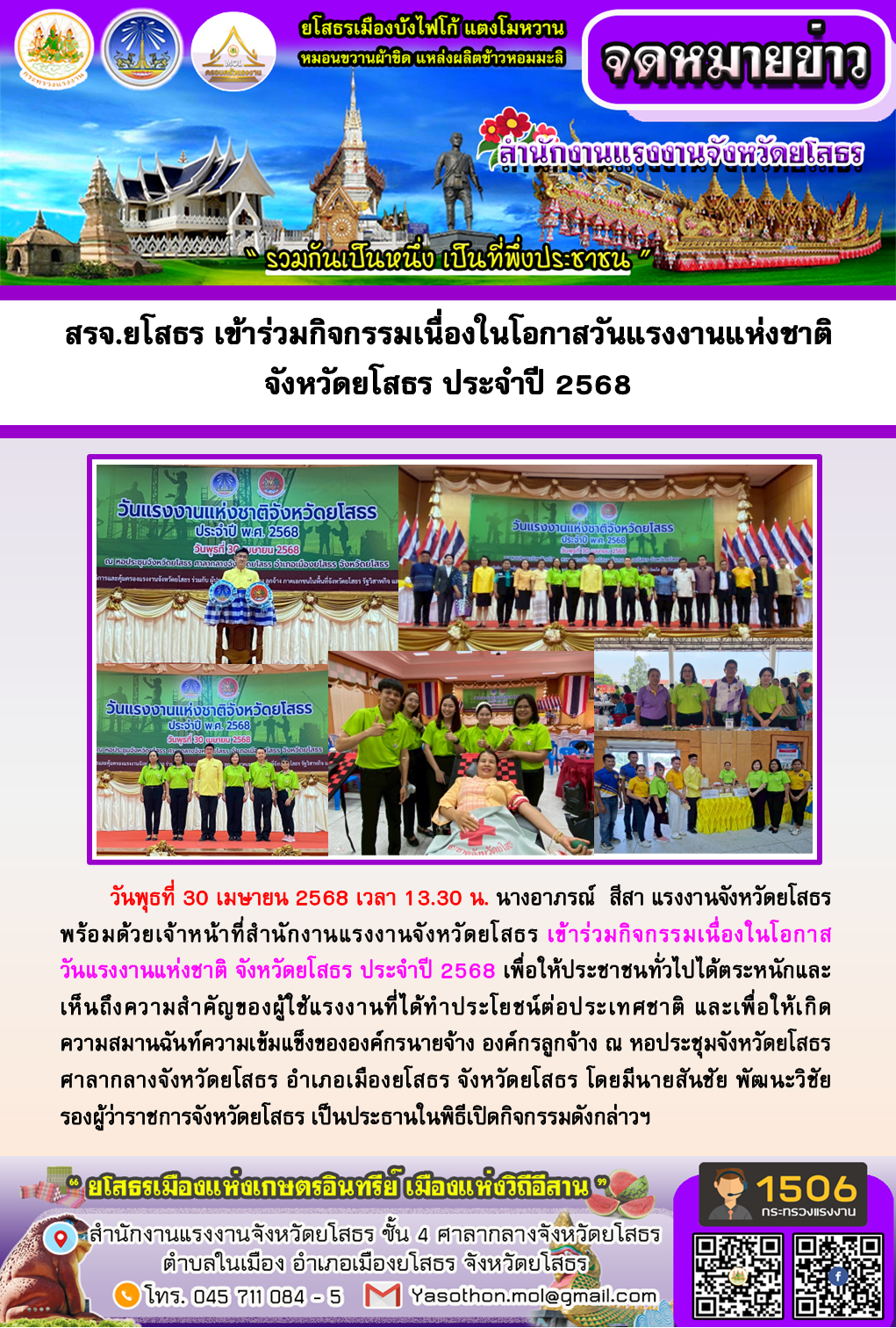 สรจ.ยโสธร เข้าร่วมกิจกรรมเนื่องในโอกาสวันแรงงานแห่งชาติ จังหวัดยโสธร ประจำปี 2568