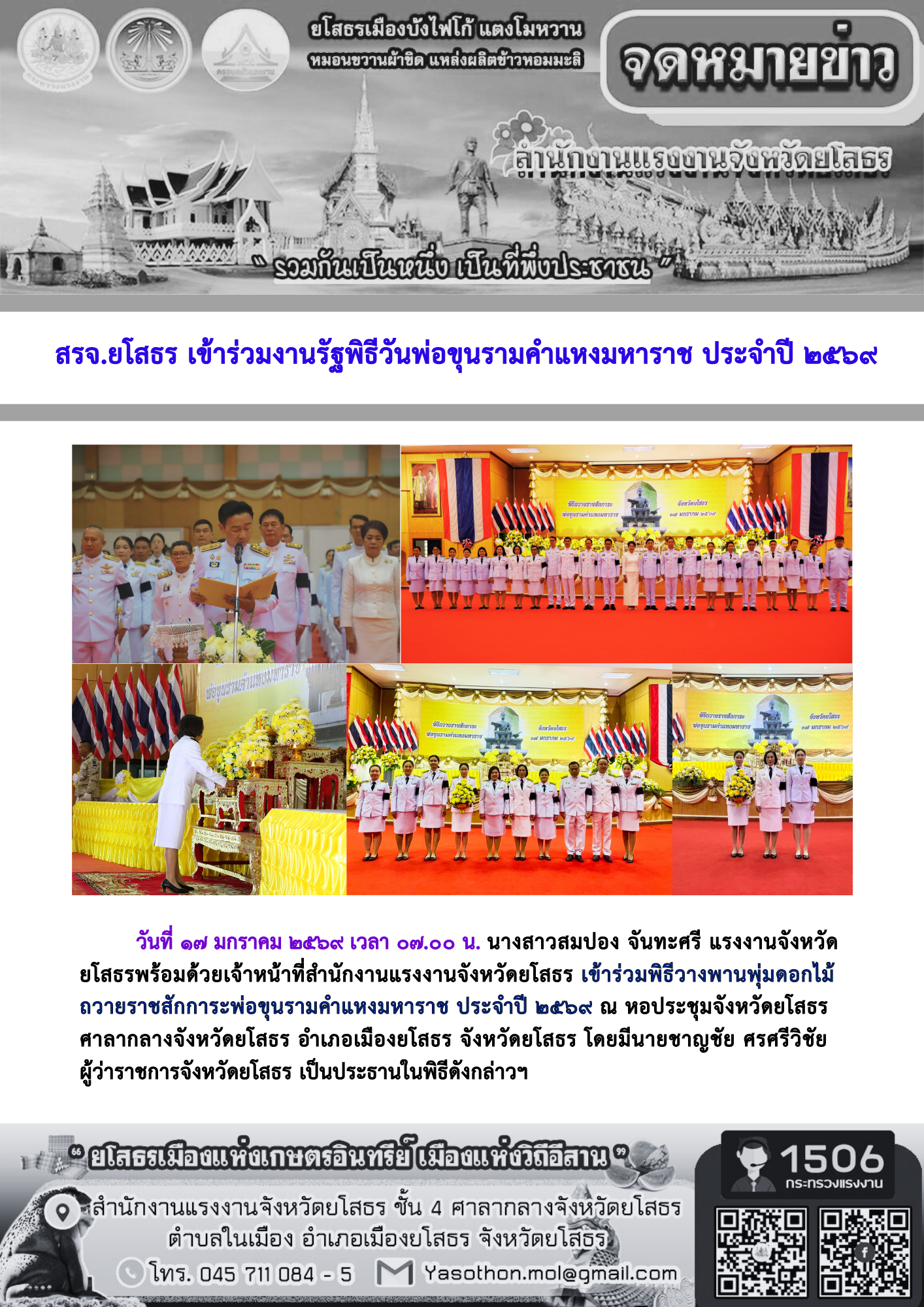 สรจ.ยโสธร เข้าร่วมงานรัฐพิธีวันพ่อขุนรามคำแหงมหาราช ประจำปี ๒๕๖๙