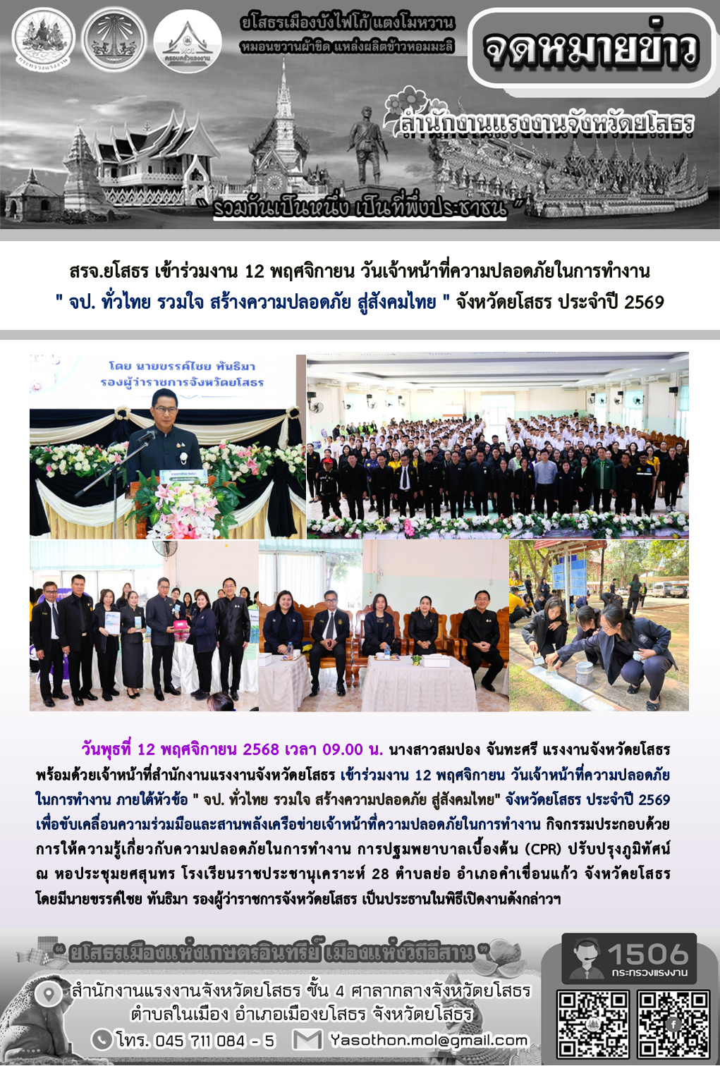 สรจ.ยโสธร เข้าร่วมงาน 12 พฤศจิกายน วันเจ้าหน้าที่ความปลอดภัยในการทำงาน ” จป. ทั่วไทย รวมใจ สร้างความปลอดภัย สู่สังคมไทย ” จังหวัดยโสธร ประจำปี 2569