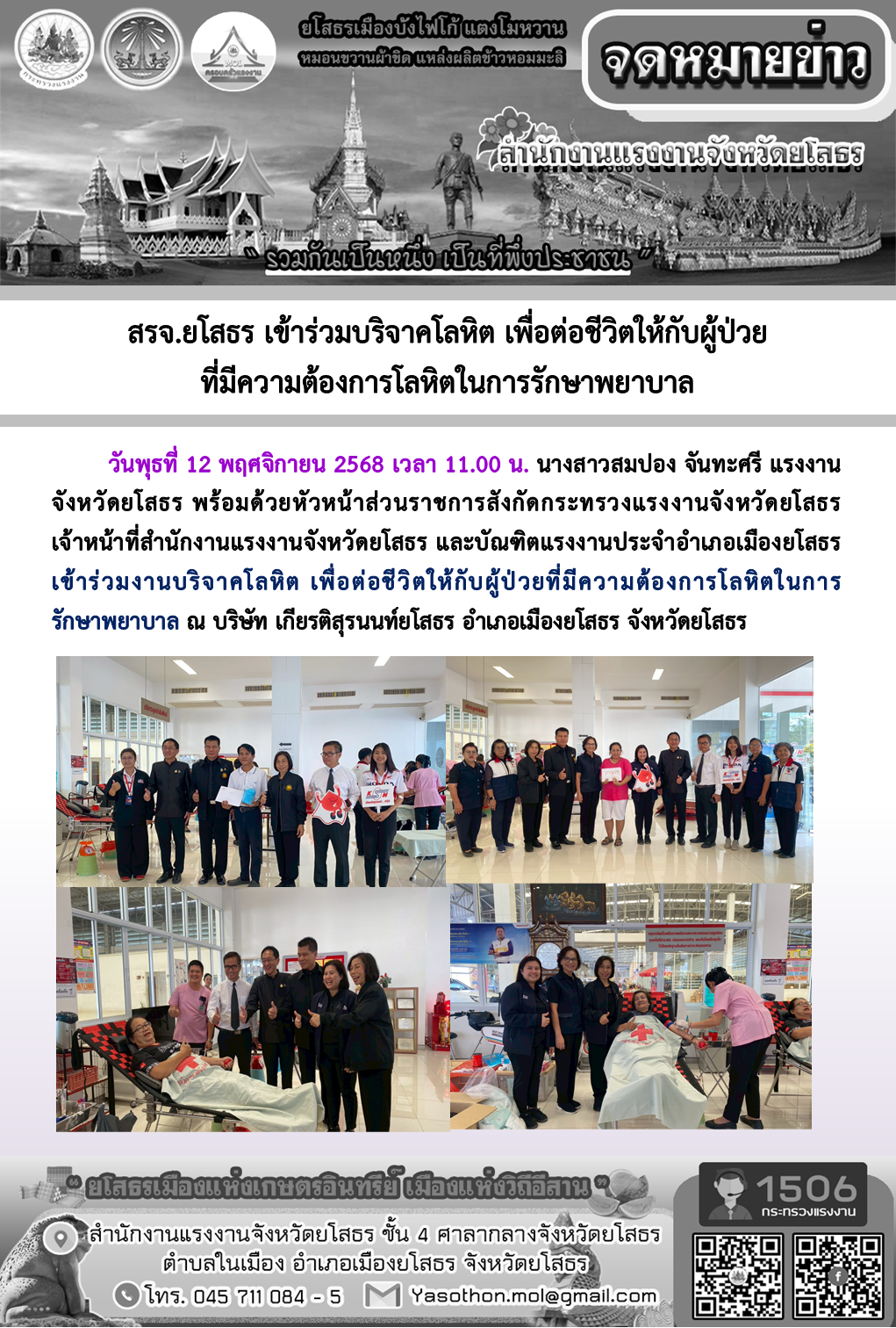 สรจ.ยโสธร เข้าร่วมบริจาคโลหิต เพื่อต่อชีวิตให้กับผู้ป่วย ที่มีความต้องการโลหิตในการรักษาพยาบาล