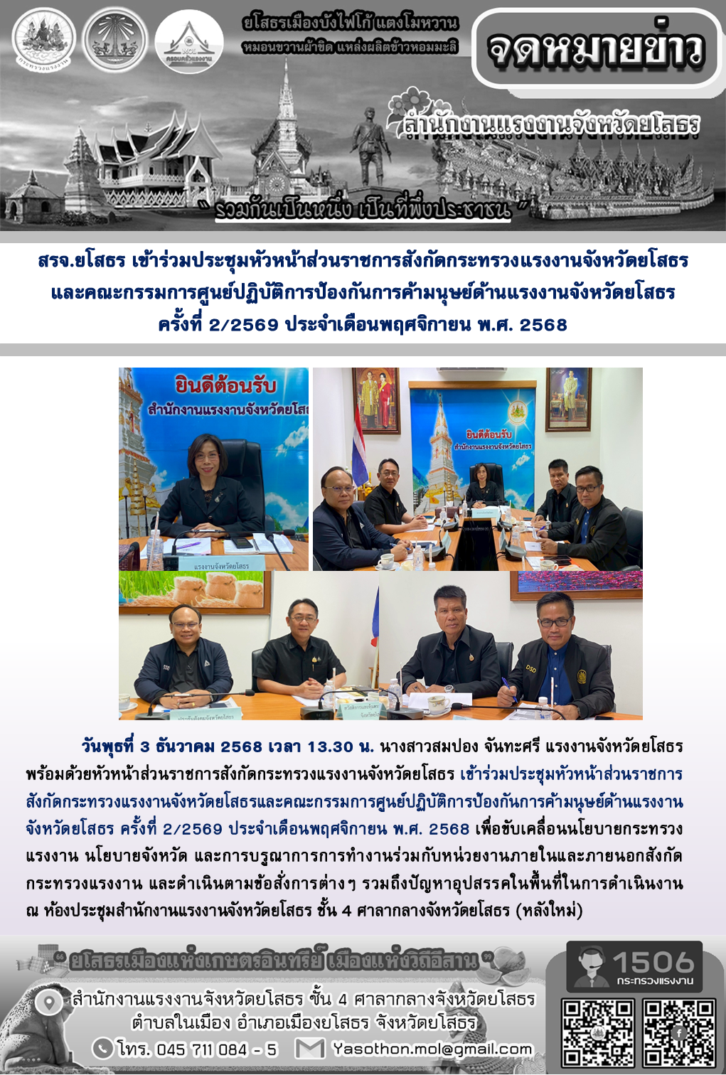 สรจ.ยโสธร เข้าร่วมประชุมหัวหน้าส่วนราชการสังกัดกระทรวงแรงงานจังหวัดยโสธร และคณะกรรมการศูนย์ปฏิบัติการป้องกันการค้ามนุษย์ด้านแรงงานจังหวัดยโสธร ครั้งที่ 2/2569 ประจำเดือนพฤศจิกายน พ.ศ. 2568
