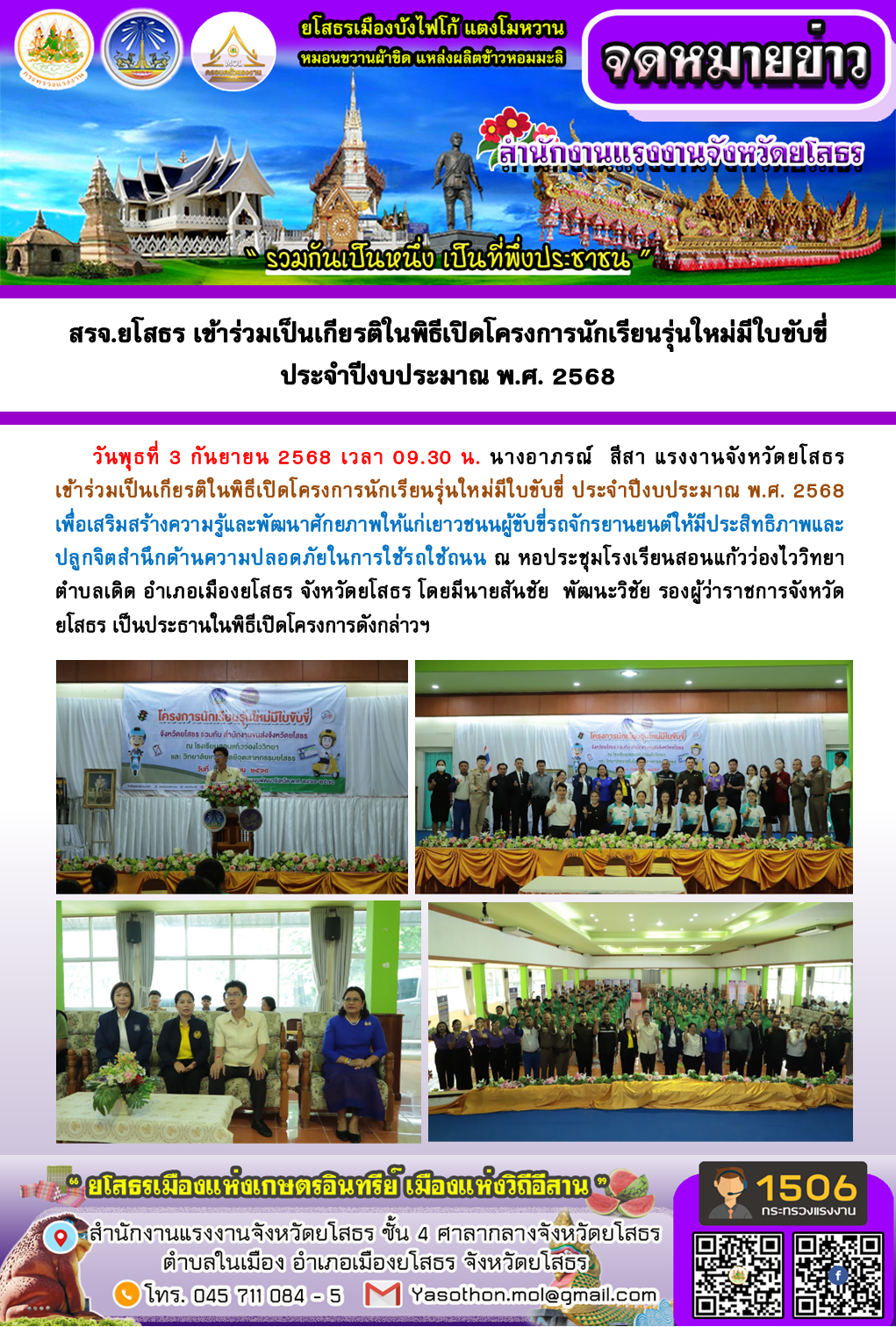 สรจ.ยโสธร เข้าร่วมเป็นเกียรติในพิธีเปิดโครงการนักเรียนรุ่นใหม่มีใบขับขี่ ประจำปีงบประมาณ พ.ศ. 2568