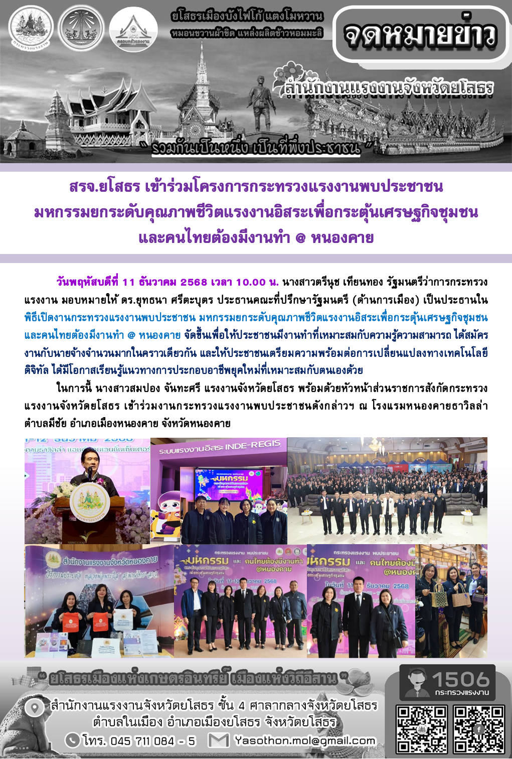 สรจ.ยโสธร เข้าร่วมโครงการกระทรวงแรงงานพบประชาชน มหกรรมยกระดับคุณภาพชีวิตแรงงานอิสระเพื่อกระตุ้นเศรษฐกิจชุมชน และคนไทยต้องมีงานทำ @ หนองคาย