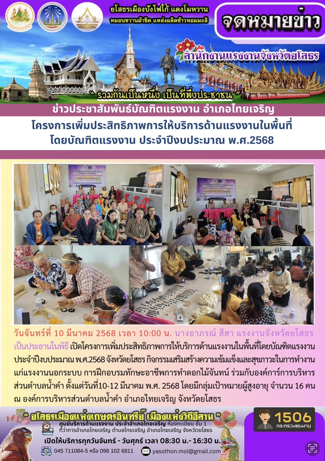 สรจ.ยโสธร เปิดโครงการเพิ่มประสิทธิภาพการให้บริการด้านแรงงานในพื้นที่ โดยบัณฑิตแรงงาน ประจำปีงบประมาณ พ.ศ. 2568 กิจกรรมเสริมสร้างความเข้มเข็งและสุขภาวะในการทำงานแก่แรงงานนอกระบบ