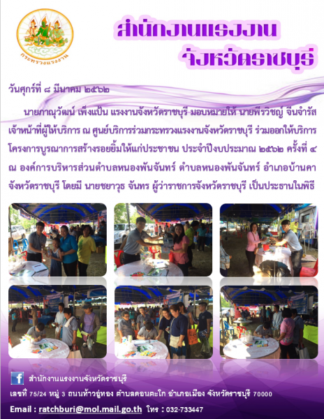 สรจ.ราชบุรี ออกให้บริการโครงการบูรณาการสร้างรอยยิ้มให้แก่ประชาชน ประจำปีงบประมาณ ๒๕๖๒ ครั้งที่ ๔ ณ องค์การบริหารส่วนตำบลหนองพันจันทร์ ตำบลพันจันทร์ อำเภอบ้านคา จังหวัดราชบุรี