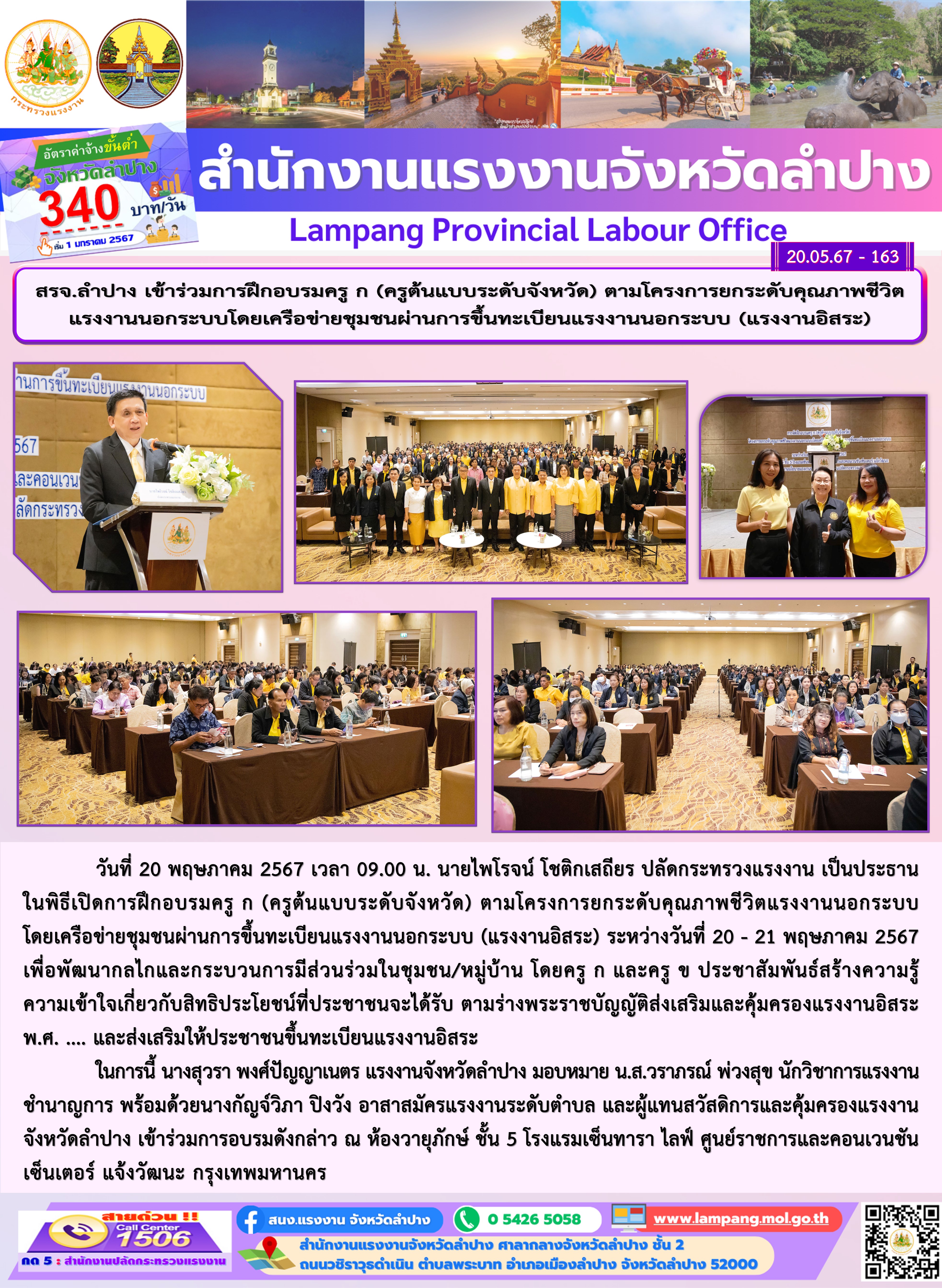 ในการนี้ นางสุวรา พงศ์ปัญญาเนตร แรงงานจังหวัดลำปาง มอบหมาย นางสาววราภรณ์ พ่วงสุข นักวิชาการแรงงานชำนาญการ พร้อมด้วยนางกัญจ์วิภา ปิงวัง อาสาสมัครแรงงานระดับตำบล และผู้แทนสวัสดิการและคุ้มครองแรงงานจังหวัดลำปาง เข้าร่วมการอบรมดังกล่าว ณ ห้องวายุภักษ์ ชั้น 5 โรงแรมเซ็นทารา ไลฟ์ ศูนย์ราชการและคอนเวนชันเซ็นเตอร์ แจ้งวัฒนะ กรุงเทพมหานคร