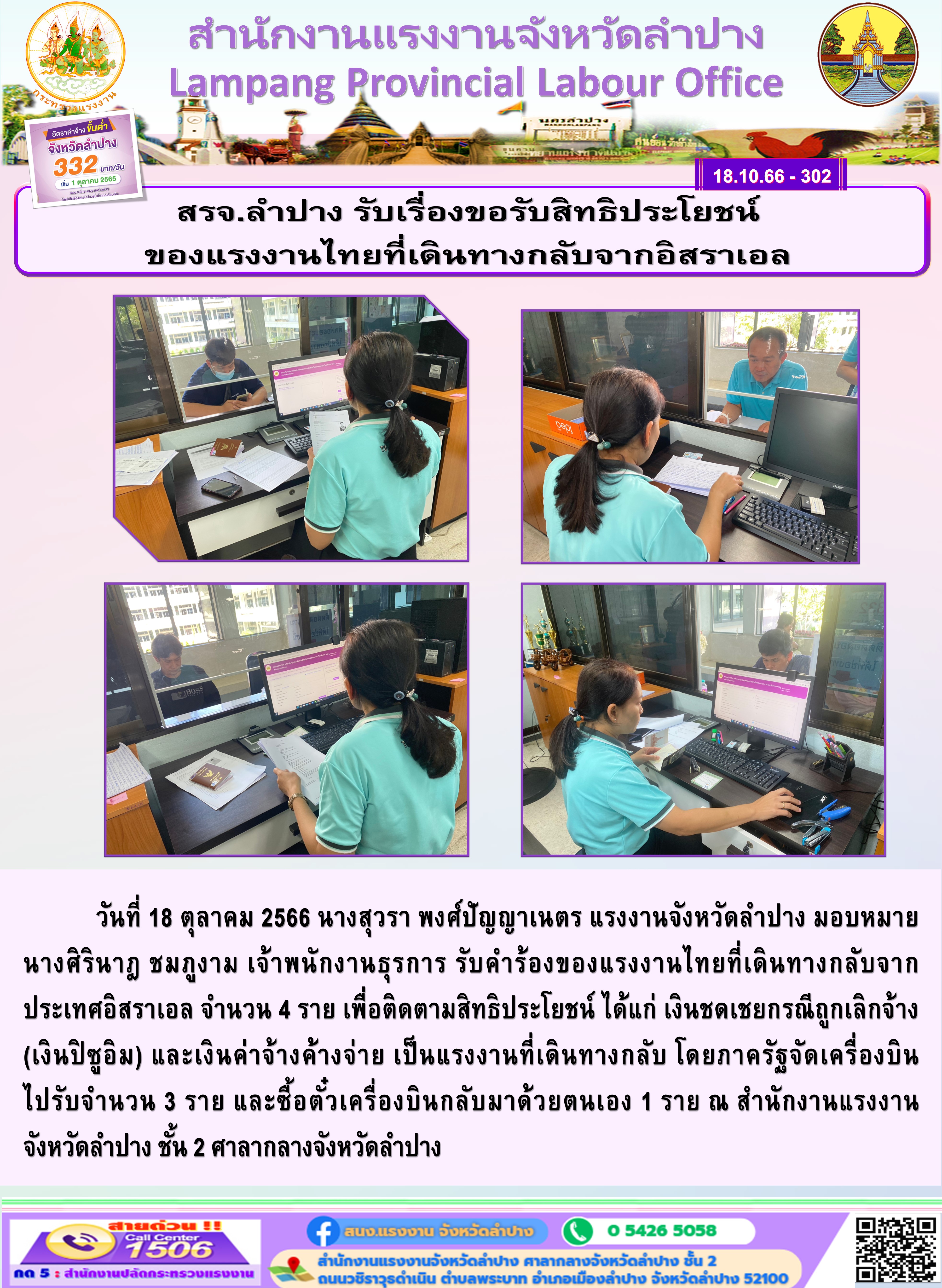 วันที่ 18 ตุลาคม 2566 นางสุวรา พงศ์ปัญญาเนตร แรงงานจังหวัดลำปาง มอบหมาย นางศิรินาฎ ชมภูงาม เจ้าพนักงานธุรการ รับคำร้องของแรงงานไทยที่เดินทางกลับจากประเทศอิสราเอล จำนวน 4 ราย เพื่อติดตามสิทธิประโยชน์ ได้แก่ เงินชดเชยกรณีถูกเลิกจ้าง (เงินปิซูอิม) และเงินค่าจ้างค้างจ่าย เป็นแรงงานที่เดินทางกลับ โดยภาครัฐจัดเครื่องบิน ไปรับจำนวน 3 ราย และซื้อตั๋วเครื่องบินกลับมาด้วยตนเอง 1 ราย ณ สำนักงานแรงงาน จังหวัดลำปาง ชั้น 2 ศาลากลางจังหวัดลำปาง