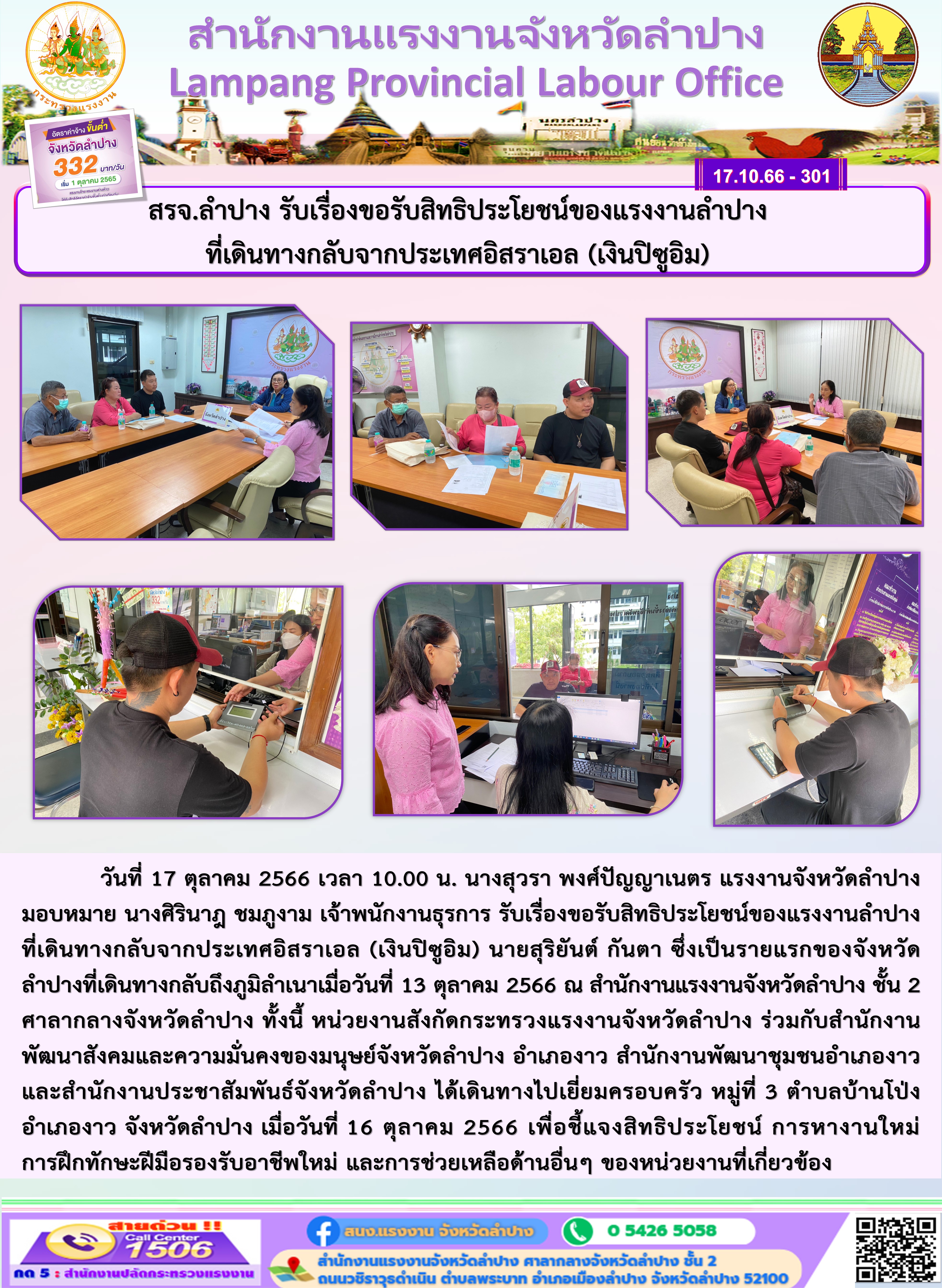 วันที่ 17 ตุลาคม 2566 เวลา 10.00 น. นางสุวรา พงศ์ปัญญาเนตร แรงงานจังหวัดลำปาง มอบหมาย นางศิรินาฎ ชมภูงาม เจ้าพนักงานธุรการ รับเรื่องขอรับสิทธิประโยชน์ของแรงงานลำปางที่เดินทางกลับจากประเทศอิสราเอล (เงินปิซูอิม) นายสุริยันต์ กันตา ซึ่งเป็นรายแรกของจังหวัดลำปางที่เดินทางกลับถึงภูมิลำเนาเมื่อวันที่ 13 ตุลาคม 2566 ณ สำนักงานแรงงานจังหวัดลำปาง ชั้น 2 ศาลากลางจังหวัดลำปาง ทั้งนี้ หน่วยงานสังกัดกระทรวงแรงงานจังหวัดลำปาง ร่วมกับสำนักงานพัฒนาสังคมและความมั่นคงของมนุษย์จังหวัดลำปาง อำเภองาว สำนักงานพัฒนาชุมชนอำเภองาว และสำนักงานประชาสัมพันธ์จังหวัดลำปาง ได้เดินทางไปเยี่ยมครอบครัว หมู่ที่ 3 ตำบลบ้านโป่ง อำเภองาว จังหวัดลำปาง เมื่อวันที่ 16 ตุลาคม 2566 เพื่อชี้แจงสิทธิประโยชน์ การหางานใหม่การฝึกทักษะฝีมือรองรับอาชีพใหม่ และการช่วยเหลือด้านอื่นๆ ของหน่วยงานที่เกี่ยวข้อง