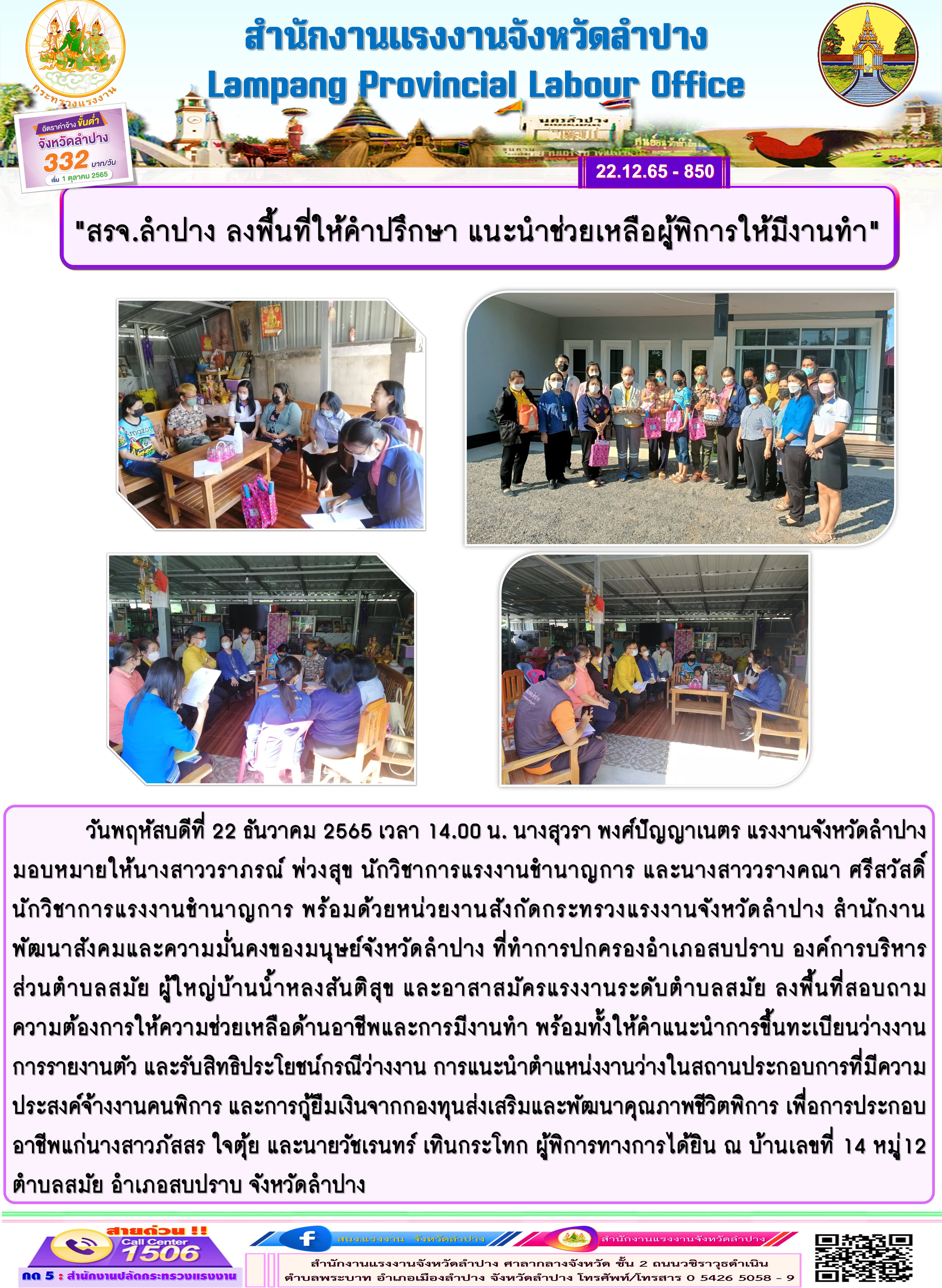วันที่พฤหัสบดีที่ 22 ธันวาคม 2565 เวลา 14.00 น. นางสุวรา พงศ์ปัญญาเนตร แรงงานจังหวัดลำปาง มอบหมายให้นางสาววราภรณ์ พ่วงสุข นักวิชาการแรงงานชำนาญการ และนางสาววรางคณา ศรีสวัสดิ์ นักวิชาการแรงงานชำนาญการ พร้อมด้วยหน่วยงานสังกัดกระทรวงแรงงานจังหวัดลำปาง สำนักงานพัฒนาสังคมและความมั่นคงของมนุษย์จังหวัดลำปาง ที่ทำการปกครองอำเภอสบปราบ องค์การบริหารส่สนตำบลสมัย ผู้ใหญ่บ้านน้ำหลงสันติสุข และอาสามัครแรงงานระดับตำบลสมัย ลงพื้นที่สอบถามความต้องการให้ความช่วยเหลือด้านอาชีพและการมีงานทำ พร้อมทั้งให้คำแนะนำการขึ้นทะเบียนว่างงาน การรายงานตัว และรับสิทธิประโยชน์กรณีว่างงาน การแนะนำตำแหน่งงานว่างในสถานประกอบการที่มีความประสงค์จ้างงานคนพิการ และการกู้ยืมเงินจากกองทุนส่งเสริมและพัฒนาคุณภาพชีวิตพิการ เพื่อการประกอบอาชีพแก่นางสาวภัสสร ใจตุ้ย และนายวัชเรนทร์ เทินกระโทก ผู้พิการทางการได้ยิน ณ บ้านเลขที่ 14 หมู่ 12 ตำบลสมัย อำเภอสบปราบ จังหวัดลำปาง