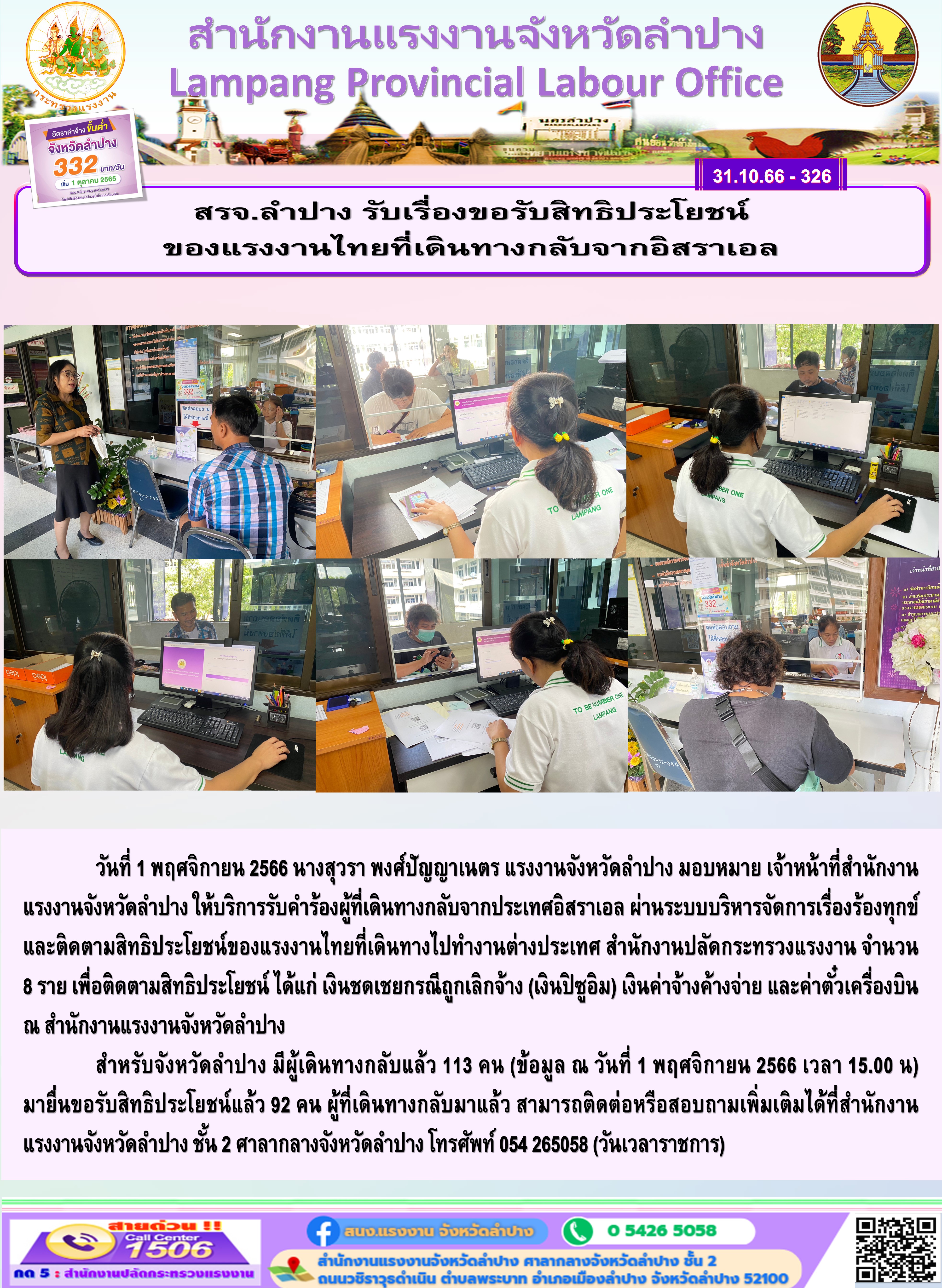 วันที่ 1 พฤศจิกายน 2566 นางสุวรา พงศ์ปัญญาเนตร แรงงานจังหวัดลำปาง มอบหมาย เจ้าหน้าที่สำนักงานแรงงานจังหวัดลำปาง ให้บริการรับคำร้องผู้ที่เดินทางกลับจากประเทศอิสราเอล ผ่านระบบบริหารจัดการเรื่องร้องทุกข์และติดตามสิทธิประโยชน์ของแรงงานไทยที่เดินทางไปทำงานต่างประเทศ สำนักงานปลัดกระทรวงแรงงาน จำนวน 8 ราย เพื่อติดตามสิทธิประโยชน์ ได้แก่ เงินชดเชยกรณีถูกเลิกจ้าง (เงินปิซูอิม) เงินค่าจ้างค้างจ่าย และค่าตั๋วเครื่องบิน ณ สำนักงานแรงงานจังหวัดลำปาง สำหรับจังหวัดลำปาง มีผู้เดินทางกลับแล้ว 113 คน (ข้อมูล ณ วันที่ 1 พฤศจิกายน 2566 เวลา 15.00 น) มายื่นขอรับสิทธิประโยชน์แล้ว 92 คน ผู้ที่เดินทางกลับมาแล้ว สามารถติดต่อหรือสอบถามเพิ่มเติมได้ที่สำนักงานแรงงานจังหวัดลำปาง ชั้น 2 ศาลากลางจังหวัดลำปาง โทรศัพท์ 054 265058 (วันเวลาราชการ)