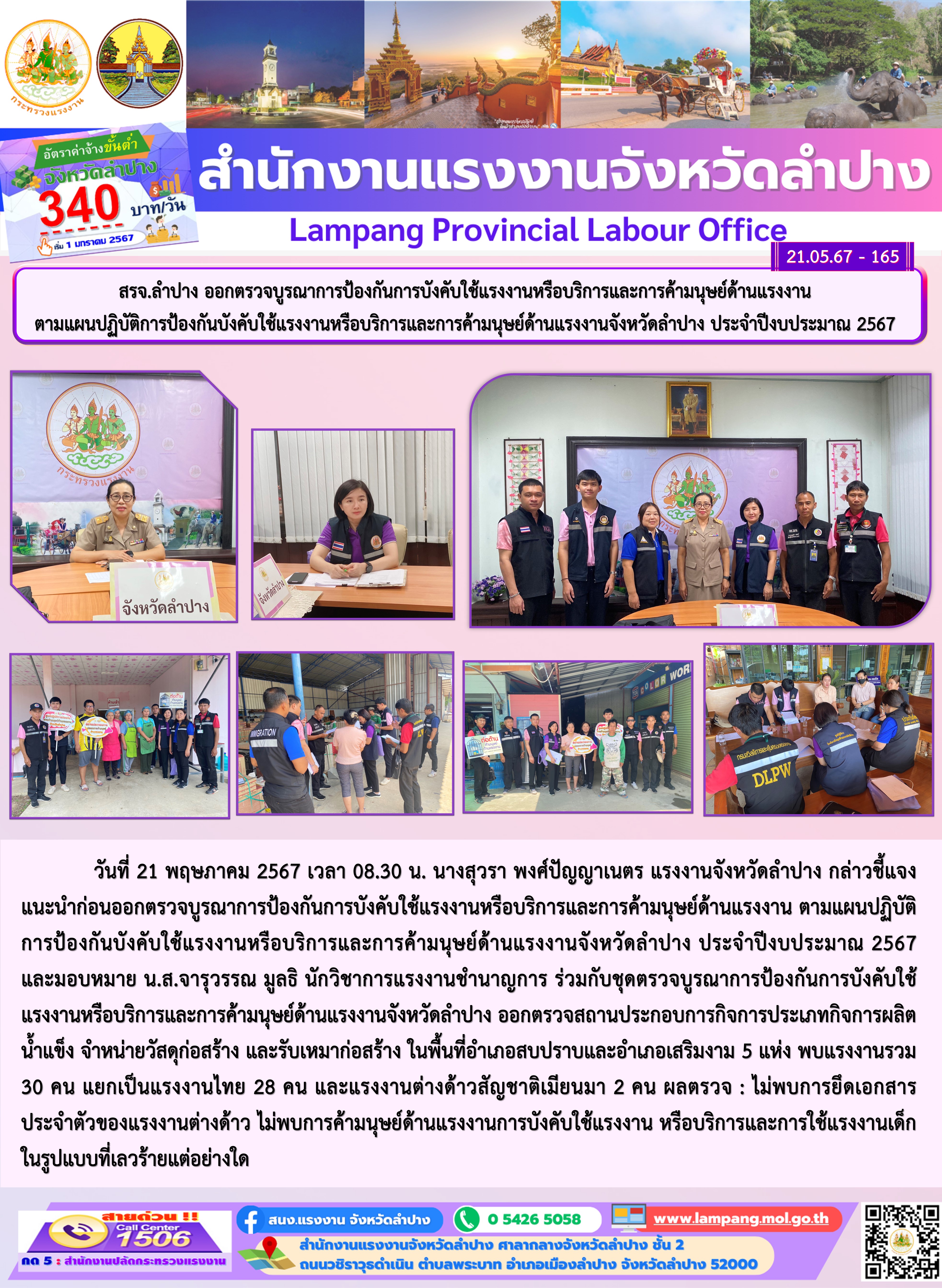 วันที่ 21 พฤษภาคม 2567 เวลา 08.30 น. นางสุวรา พงศ์ปัญญาเนตร แรงงานจังหวัดลำปาง กล่าวชี้แจง แนะนำก่อนออกตรวจบูรณาการป้องกันการบังคับใช้แรงงานหรือบริการและการค้ามนุษย์ด้านแรงงาน ตามแผนปฏิบัติการป้องกันบังคับใช้แรงงานหรือบริการและการค้ามนุษย์ด้านแรงงานจังหวัดลำปาง ประจำปีงบประมาณ 2567 และมอบหมาย น.ส.จารุวรรณ มูลธิ นักวิชาการแรงงานชำนาญการ ร่วมกับชุดตรวจบูรณาการป้องกันการบังคับใช้แรงงานหรือบริการและการค้ามนุษย์ด้านแรงงานจังหวัดลำปาง ออกตรวจสถานประกอบการกิจการประเภทกิจการผลิตน้ำแข็ง จำหน่ายวัสดุก่อสร้าง และรับเหมาก่อสร้าง ในพื้นที่อำเภอสบปราบและอำเภอเสริมงาม 5 แห่ง พบแรงงานรวม 30 คน แยกเป็นแรงงานไทย 28 คน และแรงงานต่างด้าวสัญชาติเมียนมา 2 คน ผลตรวจ : ไม่พบการยึดเอกสารประจำตัวของแรงงานต่างด้าว ไม่พบการค้ามนุษย์ด้านแรงงานการบังคับใช้แรงงาน หรือบริการและการใช้แรงงานเด็กในรูปแบบที่เลวร้ายแต่อย่างใด