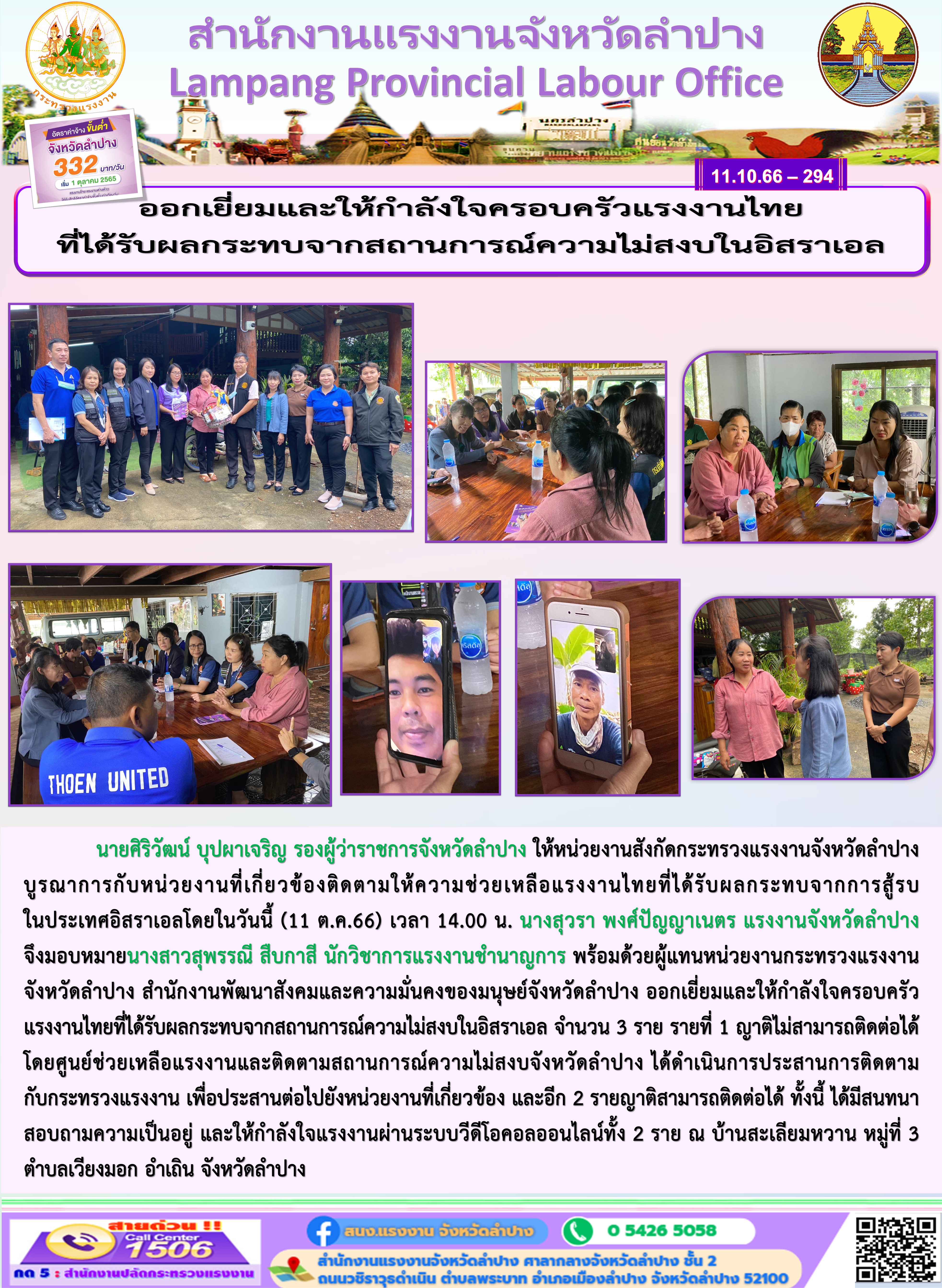 นายศิริวัฒน์ บุปผาเจริญ รองผู้ว่าราชการจังหวัดลำปาง ให้หน่วยงานสังกัดกระทรวงแรงงานจังหวัดลำปาง บูรณาการกับหน่วยงานที่เกี่ยวข้องติดตามให้ความข่วยเหลือแรงงานไทยที่ได้รับผลกระทบจากการสู้รบในประเทศอิสราเอลโดยในวันนี้ (11 ต.ค.66) เวลา 14.00 น. นางสุวรา พงศ์ปัญญาเนตร แรงงานจังหวัดลำปาง จึงมอบหมายนางสาวสุพรรณี สืบกาสี นักวิชาการแรงงานชำนาญการ พร้อมด้วยผู้แทนหน่วยงานกระทรวงแรงงานจังหวัดลำปาง สำนักงานพัฒนาสังคมและความมั่นคงของมนุษย์จังหวัดลำปาง ออกเยี่ยมและให้กำลังใจครอบครัวแรงงานไทยที่ได้รับผลกระทบจากสถานการณ์ความไม่สงบในอิสราเอล จำนวน 3 ราย รายที่ 1 ญาติไม่สามารถติดต่อได้โดยศูนย์ช่วยเหลือแรงงานและ ติดตามสถานการณ์ความไม่สงบจังหวัดลำปาง ได้ดำเนินการประสานการติดตามกับกระทรวงแรงงาน เพื่อประสานต่อไปยังหน่วยงานที่เกี่ยวข้อง และอีก 2 รายญาติสามารถติดต่อได้ ทั้งนี้ ได้มีสนทนาสอบถามความเป็นอยู่ และให้กำลังใจแรงงานผ่านระบบวีดีโอคอลออนไลน์ทั้ง 2 ราย ณ บ้านสะเลียมหวาน หมู่ที่ 3 ตำบลเวียงมอก อำเถิน จังหวัดลำปาง