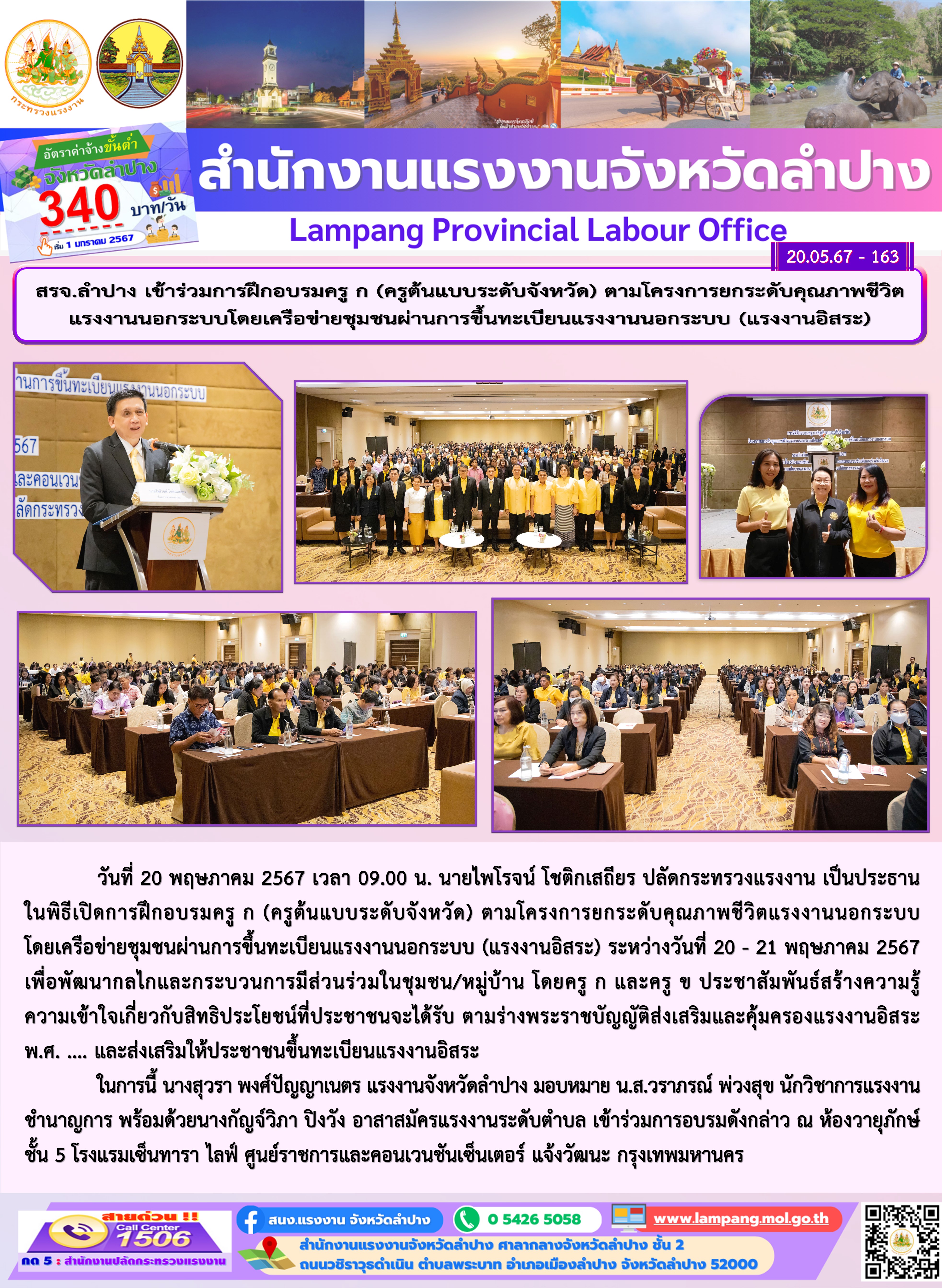 วันที่ 20 พฤษภาคม 2567 เวลา 09.00 น. นายไพโรจน์ โชติกเสถียร ปลัดกระทรวงแรงงาน เป็นประธานในพิธีเปิดการฝึกอบรมครู ก (ครูต้นแบบระดับจังหวัด) ตามโครงการยกระดับคุณภาพชีวิตแรงงานนอกระบบโดยเครือข่ายชุมชนผ่านการขึ้นทะเบียนแรงงานนอกระบบ (แรงงานอิสระ) ระหว่างวันที่ 20 – 21 พฤษภาคม 2567 เพื่อพัฒนากลไกและกระบวนการมีส่วนร่วมในชุมชน/หมู่บ้าน โดยครู ก และครู ข ประชาสัมพันธ์สร้างความรู้ ความเข้าใจเกี่ยวกับสิทธิประโยชน์ที่ประชาชนจะได้รับ ตามร่างพระราชบัญญัติส่งเสริมและคุ้มครองแรงงานอิสระ พ.ศ. …. และส่งเสริมให้ประชาชนขึ้นทะเบียนแรงงานอิสระ