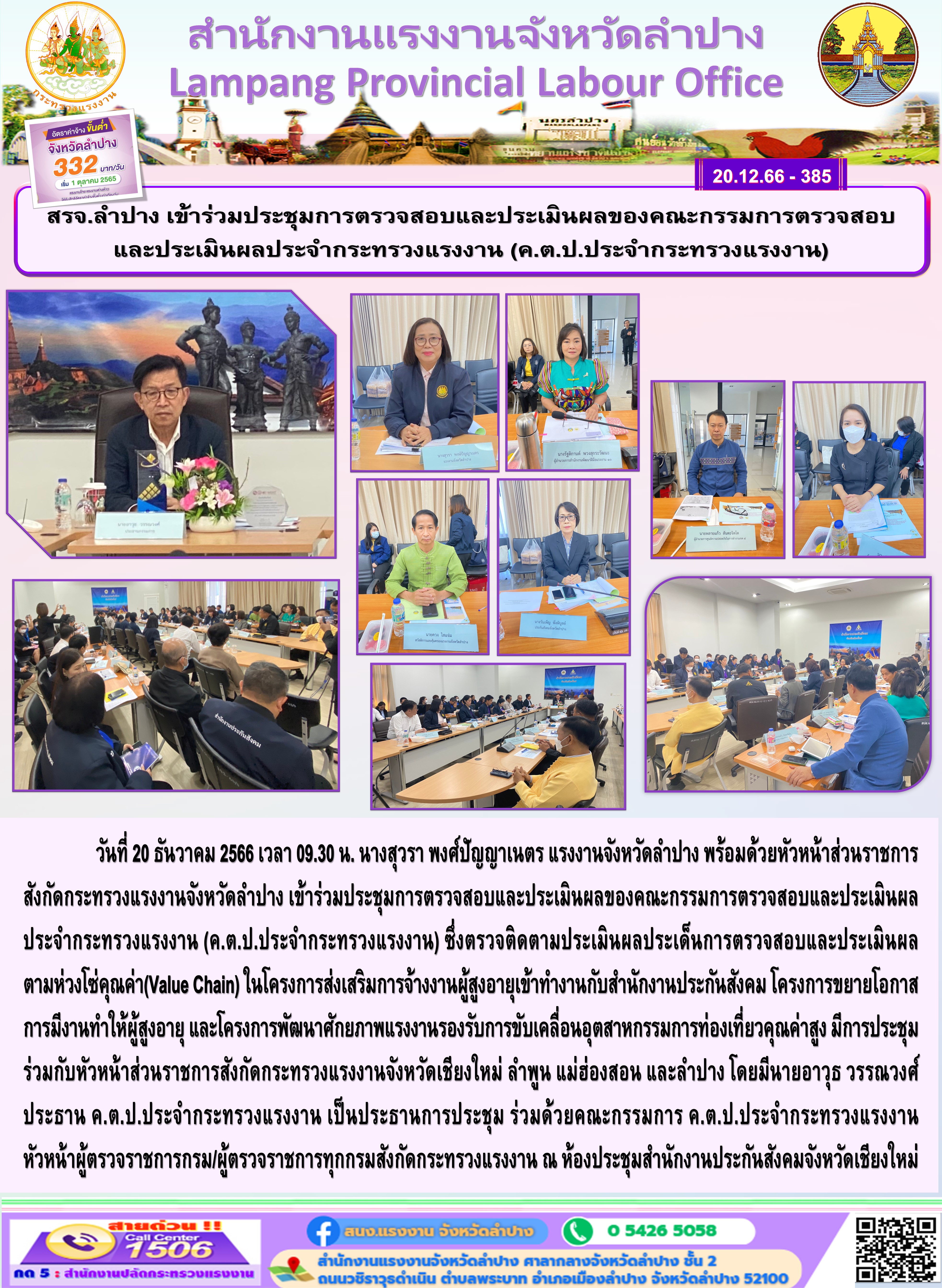 วันที่ 20 ธันวาคม 2566 เวลา 09.30 น. นางสุวรา พงศ์ปัญญาเนตร แรงงานจังหวัดลำปาง พร้อมด้วยหัวหน้าส่วนราชการสังกัดกระทรวงแรงงานจังหวัดลำปาง เข้าร่วมประชุมการตรวจสอบและประเมินผลของคณะกรรมการตรวจสอบและประเมินผลประจำกระทรวงแรงงาน (ค.ต.ป.ประจำกระทรวงแรงงาน) ซึ่งตรวจติดตามประเมินผลประเด็นการตรวจสอบและประเมินผล ตามห่วงโซ่คุณค่า(Value Chain) ในโครงการส่งเสริมการจ้างงานผู้สูงอายุเข้าทำงานกับสำนักงานประกันสังคม โครงการขยายโอกาสการมีงานทำให้ผู้สูงอายุ และโครงการพัฒนาศักยภาพแรงงานรองรับการขับเคลื่อนอุตสาหกรรมการท่องเที่ยวคุณค่าสูง มีการประชุม ร่วมกับหัวหน้าส่วนราชการสังกัดกระทรวงแรงงานจังหวัดเชียงใหม่ ลำพูน แม่ฮ่องสอน และลำปาง โดยมีนายอาวุธ วรรณวงศ์ ประธาน ค.ต.ป.ประจำกระทรวงแรงงาน เป็นประธานการประชุม ร่วมด้วยคณะกรรมการ ค.ต.ป.ประจำกระทรวงแรงงาน หัวหน้าผู้ตรวจราชการกรม/ผู้ตรวจราชการทุกกรมสังกัดกระทรวงแรงงาน ณ ห้องประชุมสำนักงานประกันสังคมจังหวัดเชียงใหม่