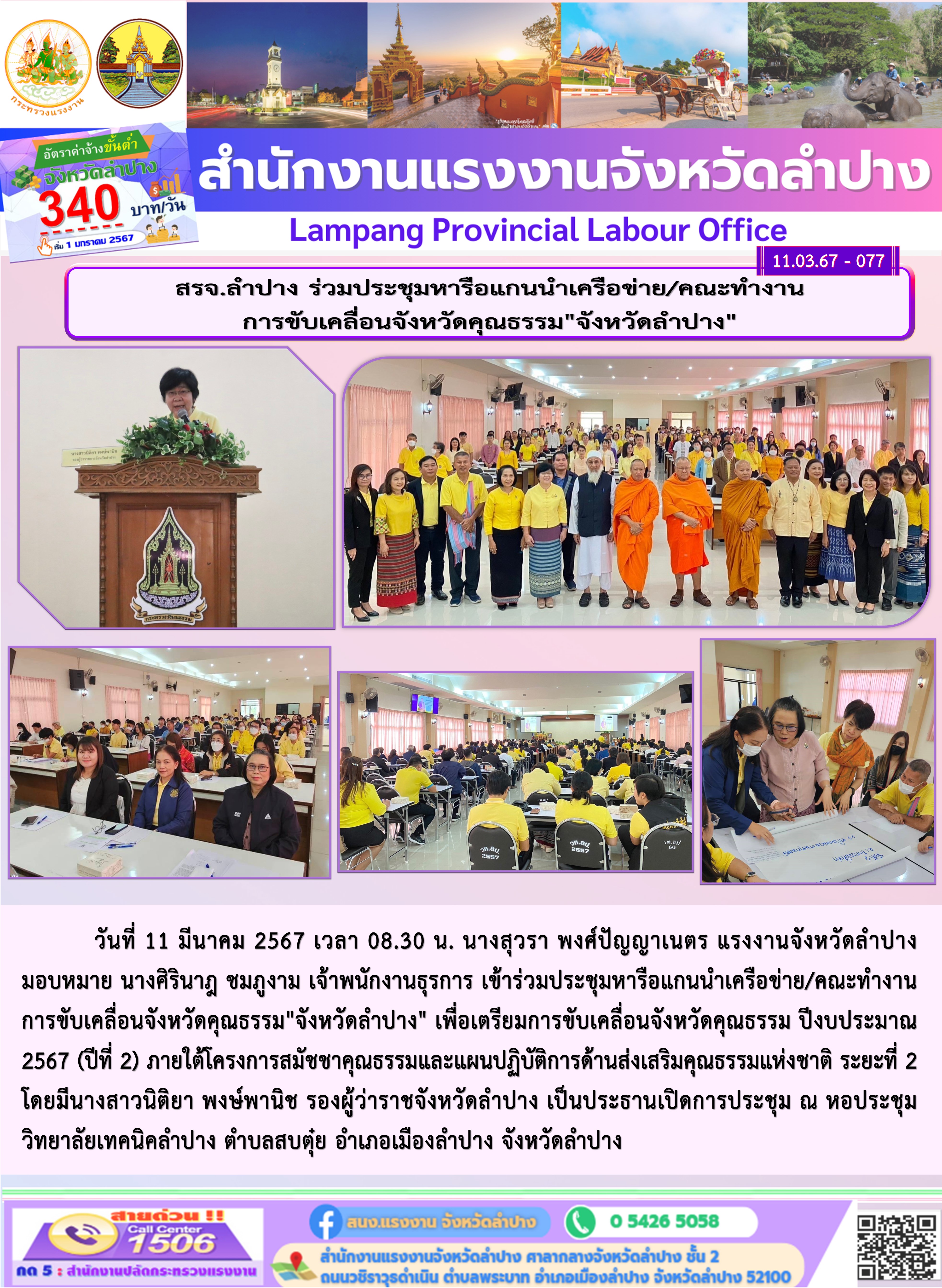 วันที่ 11 มีนาคม 2567 เวลา 08.30 น. นางสุวรา พงศ์ปัญญาเนตร แรงงานจังหวัดลำปาง มอบหมาย นางศิรินาฎ ชมภูงาม เจ้าพนักงานธุรการ เข้าร่วมประชุมหารือแกนนำเครือข่าย/คณะทำงาน การขับเคลื่อนจังหวัดคุณธรรม”จังหวัดลำปาง” เพื่อเตรียมการขับเคลื่อนจังหวัดคุณธรรม ปีงบประมาณ 2567 (ปีที่ 2) ภายใต้โครงการสมัชชาคุณธรรมและแผนปฏิบัติการด้านส่งเสริมคุณธรรมแห่งชาติ ระยะที่ 2 โดยมีนางสาวนิติยา พงษ์พานิช รองผู้ว่าราชจังหวัดลำปาง เป็นประธานเปิดการประชุม ณ หอประชุมวิทยาลัยเทคนิคลำปาง ตำบลสบตุ๋ย อำเภอเมืองลำปาง จังหวัดลำปาง