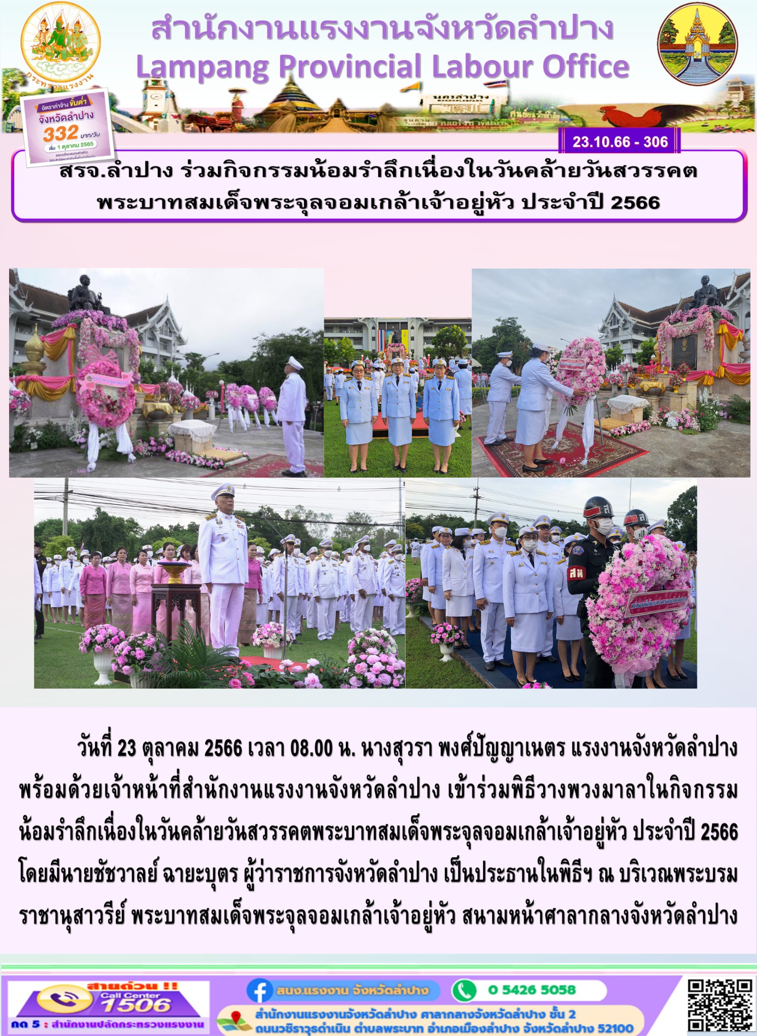 วันที่ 23 ตุลาคม 2566 เวลา 08.00 น. นางสุวรา พงศ์ปัญญาเนตร แรงงานจังหวัดลำปาง พร้อมด้วยเจ้าหน้าที่สำนักงานแรงงานจังหวัดลำปาง เข้าร่วมพิธีวางพวงมาลาในกิจกรรม น้อมรำลึกเนื่องในวันคล้ายวันสวรรคตพระบาทสมเด็จพระจุลจอมเกล้าเจ้าอยู่หัว ประจำปี 2566 โดยมีนายชัชวาลย์ ฉายะบุตร ผู้ว่าราชการจังหวัดลำปาง เป็นประธานในพิธีฯ ณ บริเวณพระบรมราชานุสาวรีย์ พระบาทสมเด็จพระจุลจอมเกล้าเจ้าอยู่หัว สนามหน้าศาลากลางจังหวัดลำปาง
