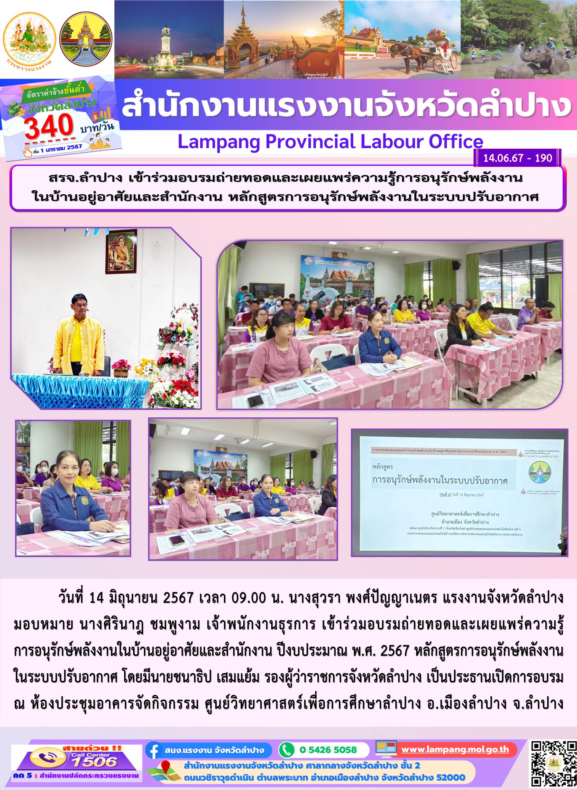 วันที่ 14 มิถุนายน 2567 เวลา 09.00 น. นางสุวรา พงศ์ปัญญาเนตร แรงงานจังหวัดลำปาง มอบหมาย นางศิรินาฎ ชมพูงาม เจ้าพนักงานธุรการ เข้าร่วมอบรมถ่ายทอดและเผยแพร่ความรู้ การอนุรักษ์พลังงานในบ้านอยู่อาศัยและสำนักงาน ปีงบประมาณ พ.ศ. 2567 หลักสูตรการอนุรักษ์พลังงานในระบบปรับอากาศ โดยมีนายชนาธิป เสมแย้ม รองผู้ว่าราชการจังหวัดลำปาง เป็นประธานเปิดการอบรม ณ ห้องประชุมอาคารจัดกิจกรรม ศูนย์วิทยาศาสตร์เพื่อการศึกษาลำปาง อ.เมืองลำปาง จ.ลำปาง