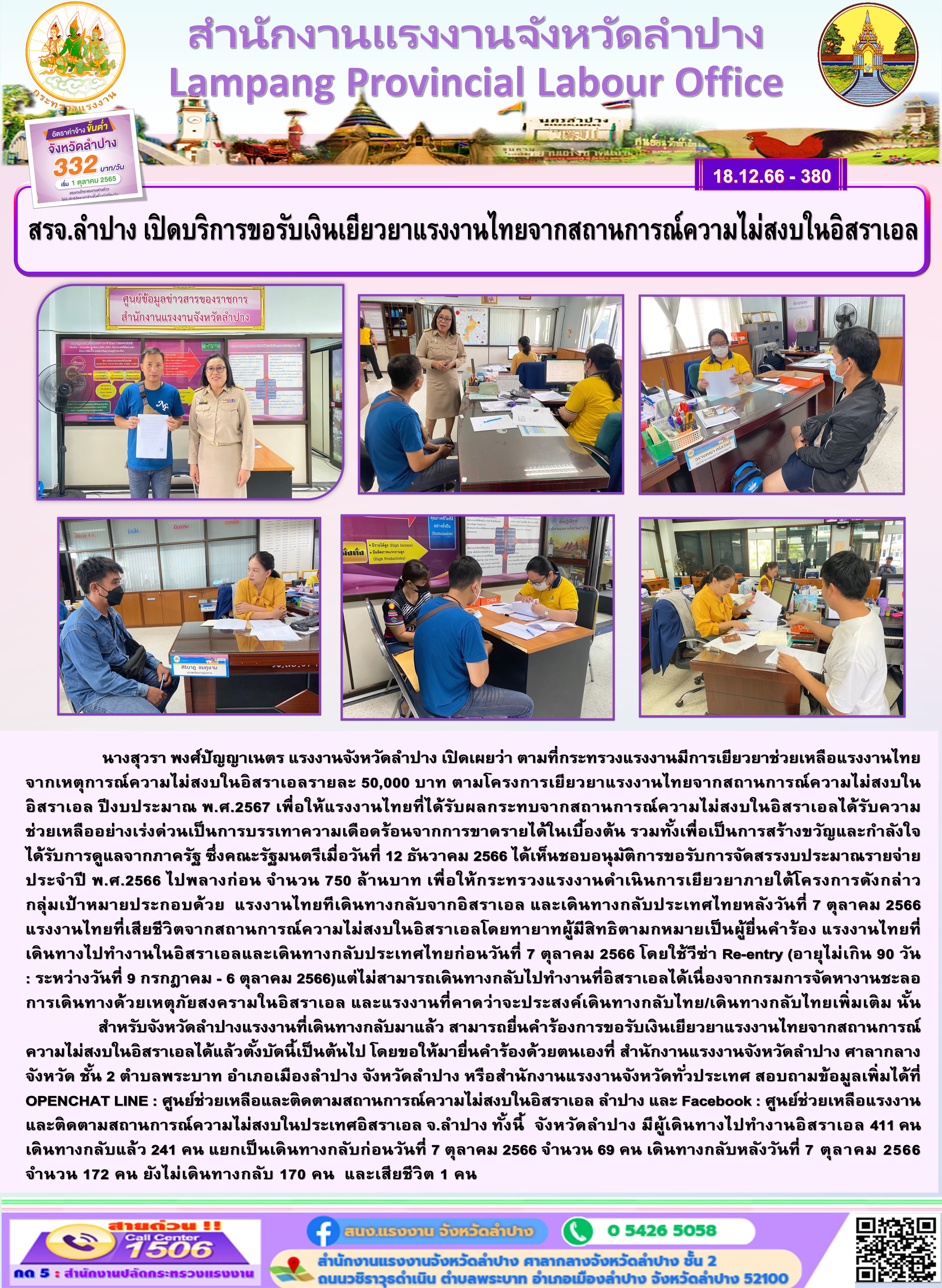 นางสุวรา พงศ์ปัญญาเนตร แรงงานจังหวัดลำปาง เปิดเผยว่า ตามที่กระทรวงแรงงานมีการเยียวยาช่วยเหลือแรงงานไทยจากเหตุการณ์ความไม่สงบในอิสราเอลรายละ 50,000 บาท ตามโครงการเยียวยาแรงงานไทยจากสถานการณ์ความไม่สงบในอิสราเอล ปีงบประมาณ พ.ศ.2567 เพื่อให้แรงงานไทยที่ได้รับผลกระทบจากสถานการณ์ความไม่สงบในอิสราเอลได้รับความช่วยเหลืออย่างเร่งด่วนเป็นการบรรเทาความเดือดร้อนจากการขาดรายได้ในเบื้องต้น รวมทั้งเพื่อเป็นการสร้างขวัญและกำลังใจได้รับการดูแลจากภาครัฐ ซึ่งคณะรัฐมนตรีเมื่อวันที่ 12 ธันวาคม 2566 ได้เห็นชอบอนุมัติการขอรับการจัดสรรงบประมาณรายจ่ายประจำปี พ.ศ.2566 ไปพลางก่อน จำนวน 750 ล้านบาท เพื่อให้กระทรวงแรงงานดำเนินการเยียวยาภายใต้โครงการดังกล่าว กลุ่มเป้าหมายประกอบด้วย แรงงานไทยทีเดินทางกลับจากอิสราเอล และเดินทางกลับประเทศไทยหลังวันที่ 7 ตุลาคม 2566 แรงงานไทยที่เสียชีวิตจากสถานการณ์ความไม่สงบในอิสราเอลโดยทายาทผู้มีสิทธิตามกหมายเป็นผู้ยื่นคำร้อง แรงงานไทยที่เดินทางไปทำงานในอิสราเอลและเดินทางกลับประเทศไทยก่อนวันที่ 7 ตุลาคม 2566 โดยใช้วีซ่า Re-entry (อายุไม่เกิน 90 วัน : ระหว่างวันที่ 9 กรกฎาคม – 6 ตุลาคม 2566)แต่ไม่สามารถเดินทางกลับไปทำงานที่อิสราเอลได้เนื่องจากกรมการจัดหางานชะลอการเดินทางด้วยเหตุภัยสงคราม ในอิสราเอล และแรงงานที่คาดว่าจะประสงค์เดินทางกลับไทย/เดินทางกลับไทยเพิ่มเติม นั้น