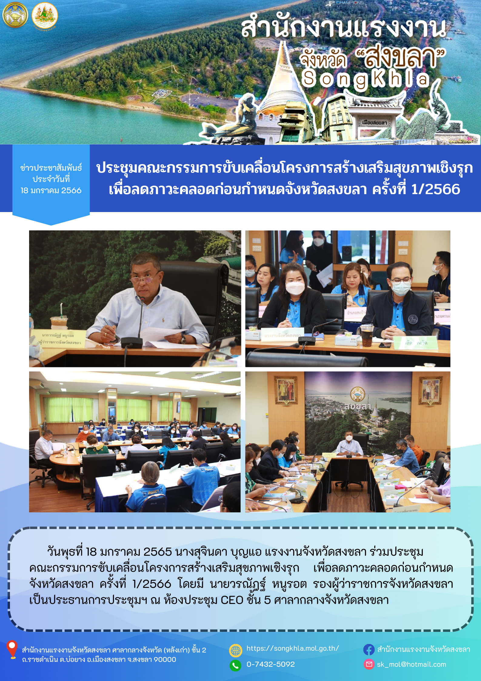 วันพุธที่ 18 มกราคม 2565 นางสุจินดา บุญแอ แรงงานจังหวัดสงขลา ร่วมประชุมคณะกรรมการขับเคลื่อนโครงการสร้างเสริมสุขภาพเชิงรุก เพื่อลดภาวะคลอดก่อนกำหนดจังหวัดสงขลา ครั้งที่ 1/2566 โดยมี นายวรณัฎฐ์ หนูรอต รองผู้ว่าราชการจังหวัดสงขลา เป็นประธานการประชุมฯ ณ ห้องประชุม CEO ชั้น 5 ศาลากลางจังหวัดสงขลา