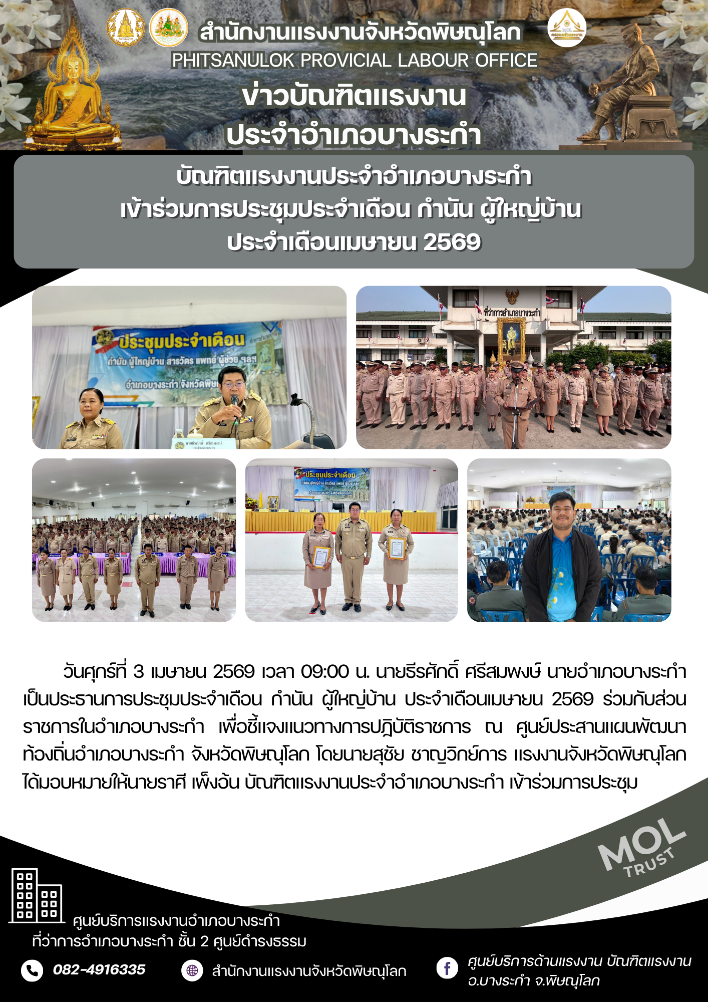บัณฑิตเเรงงานประจำอำเภอบางระกำ เข้าร่วมการประชุมประจำเดือน กำนัน ผู้ใหญ่บ้าน ประจำเดือนเมษายน 2569