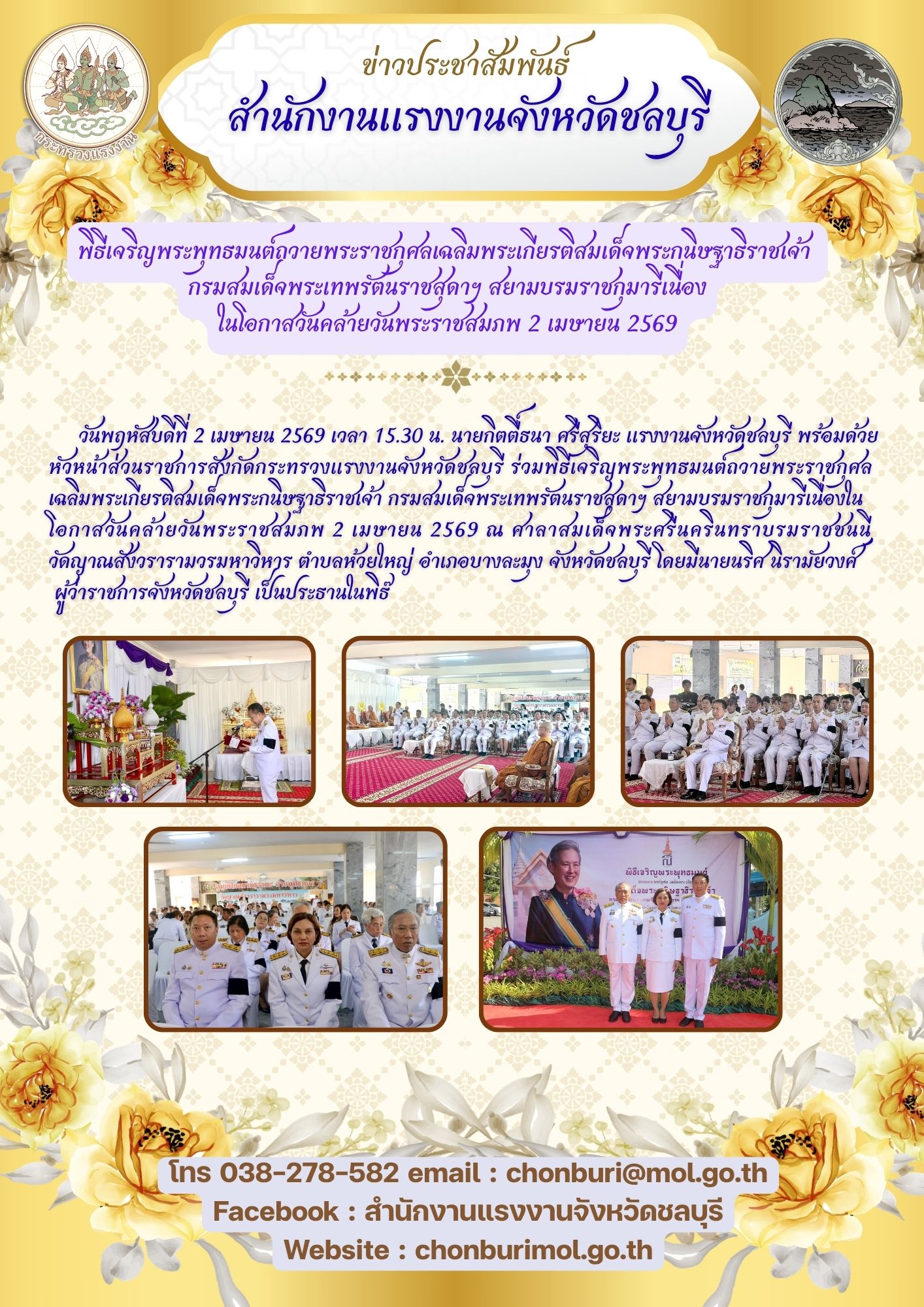 ชลบุรีจัดพิธีเจริญพระพุทธมนต์ เฉลิมพระเกียรติสมเด็จพระกนิษฐาธิราชเจ้า กรมสมเด็จพระเทพรัตนราชสุดาฯ สยามบรมราชกุมารี