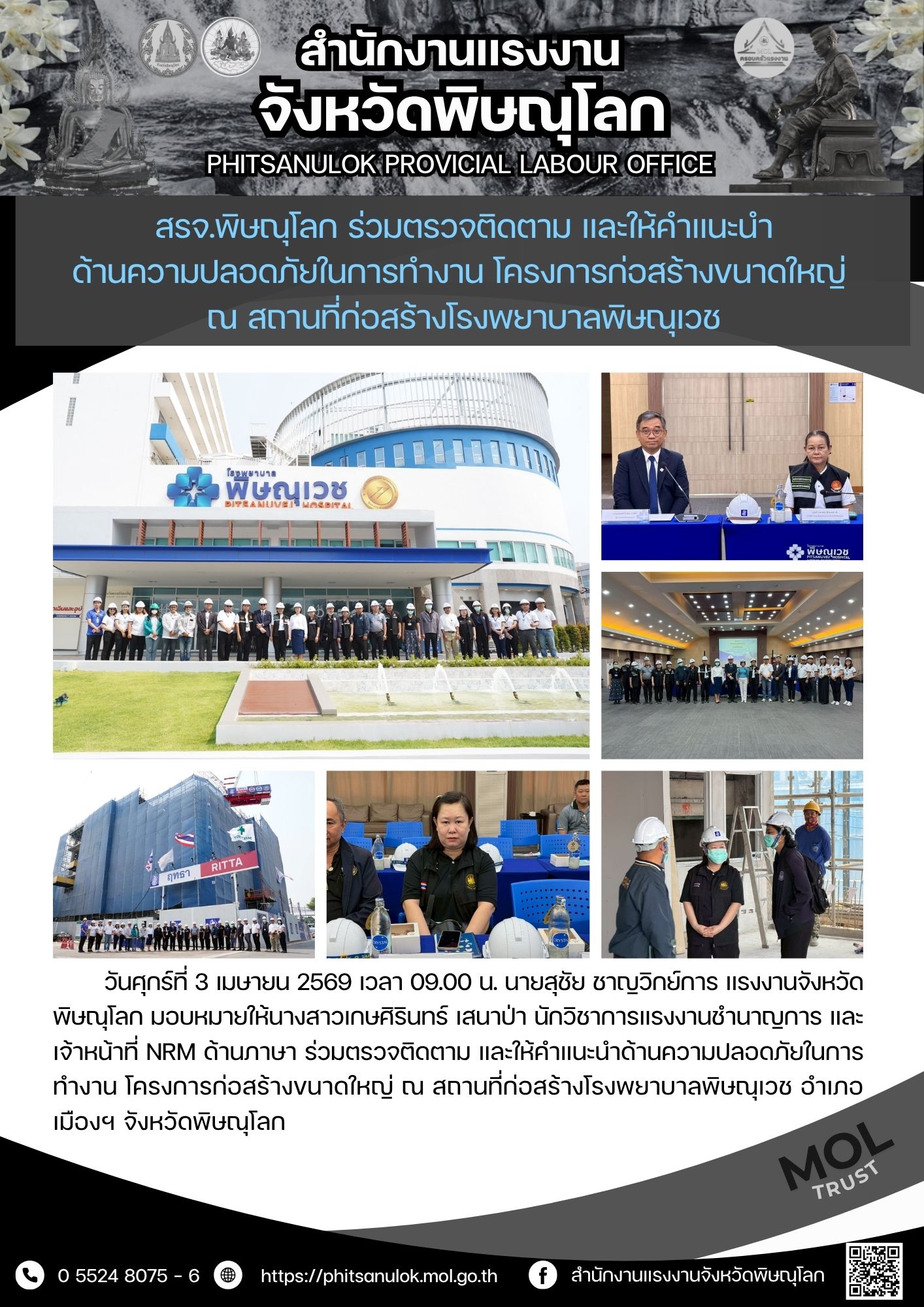 สรจ.พิษณุโลก ร่วมตรวจติดตาม และให้คำแนะนำ ด้านความปลอดภัยในการทำงาน โครงการก่อสร้างขนาดใหญ่ ณ สถานที่ก่อสร้างโรงพยาบาลพิษณุเวช